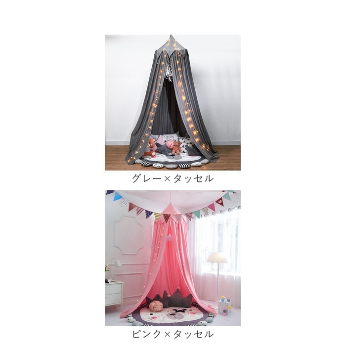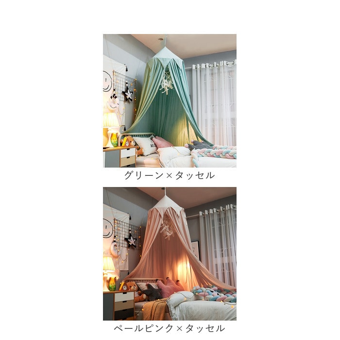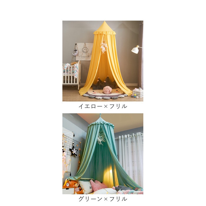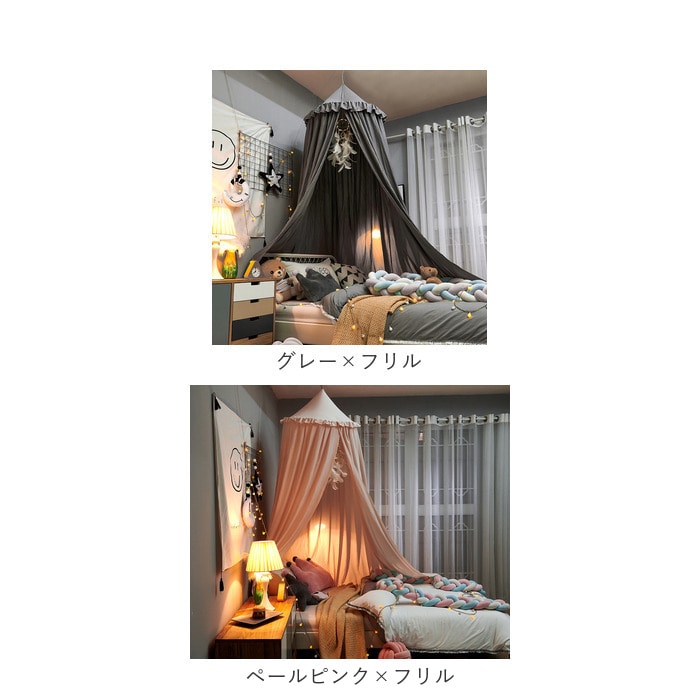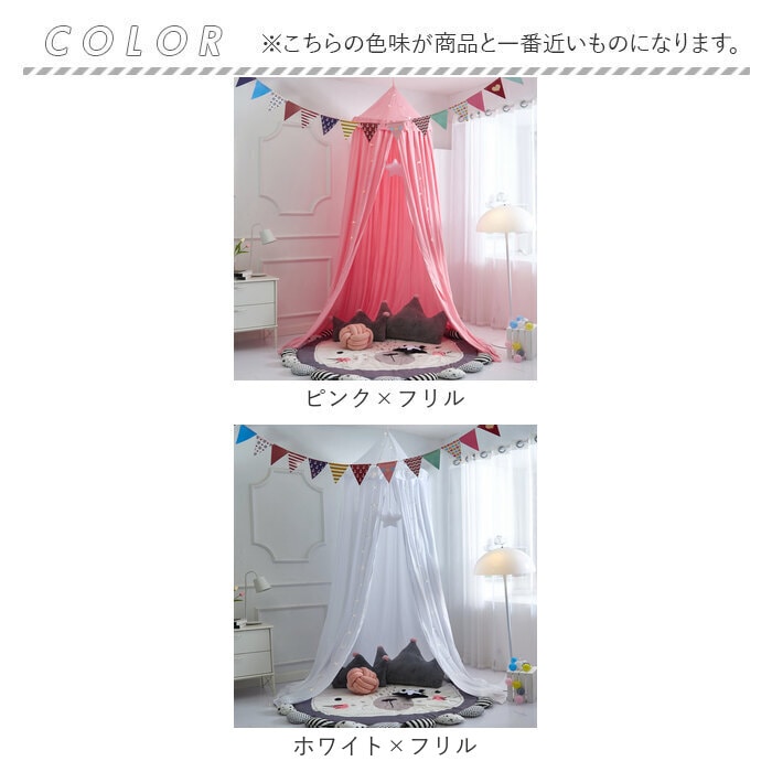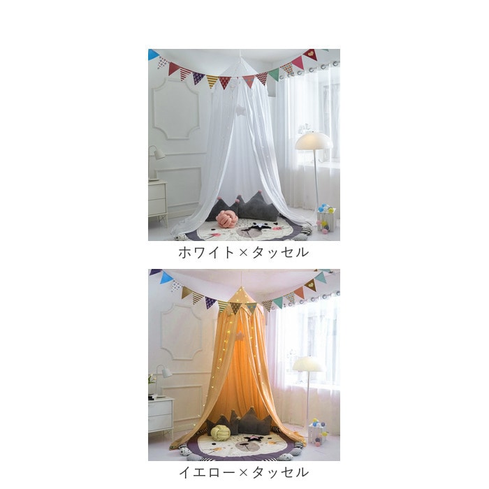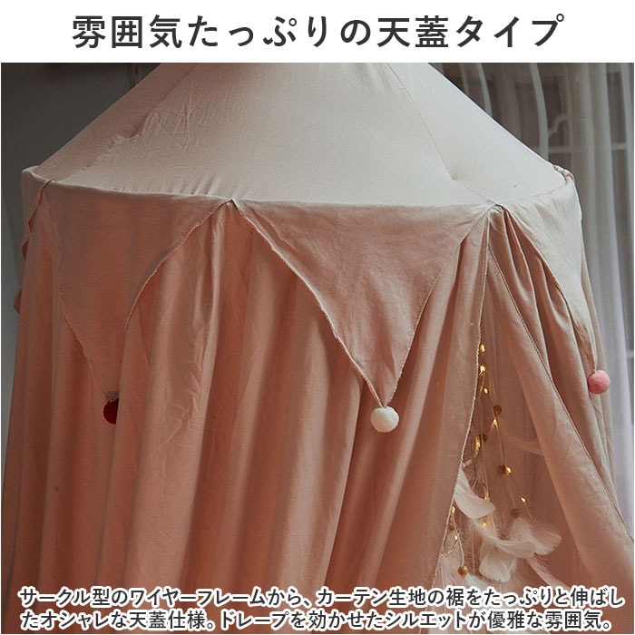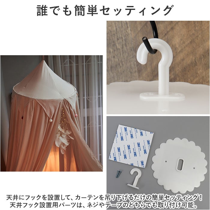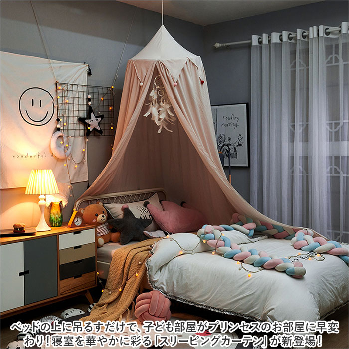 | 商品説明 | ベッドの上に吊るすだけで、子ども部屋がプリンセスのお部屋に早変わり!寝室を華やかに彩る「スリーピングカーテン」が新登場!【リラックスタイムをより快適に】・「屋外の明かりや照明の光が強すぎて・・・」「エアコンの風が直接当たって冷えが気になる・・・」。そんなお休みタイムのお悩みは「スリーピングカーテン」が解決!【雰囲気たっぷりの天蓋タイプ】サークル型のワイヤーフレームから、カーテン生地の裾をたっぷりと伸ばしたオシャレな天蓋仕様。ドレープを効かせたシルエットが優雅な雰囲気。【ベッドタイムはプリンセスに変身】子ども部屋のベッドや、お気に入りのおもちゃやぬいぐるみを並べたプレイスペースに設置するだけで、おとぎ話のプリンセス気分♪【ベビーに優しい環境づくり】ベビーベッドを覆うように取り付ければ、蚊などの虫除け、エアコンの風除けとして、赤ちゃんのためのよりよい睡眠環境づくりに最適。【大人も安らぐプライベート空間】巣ごもりタイムをゆったり過ごしたい♪お部屋の一角に、大人のプライベートスペースを確保したいときにも大活躍!【オールシーズン快適な素材感】カーテン生地には、ふわりと翻る薄手のファブリックを使用。夏場の蒸し暑さが気になる季節でも、サラッと気持ちのよい肌触り。【誰でも簡単セッティング】天井に専用フックを設置して、天蓋カーテンを吊り下げるだけの簡単セッティング!天井フック設置用パーツは、付属のネジや3M製強力両面テープのどちらでも取り付け可能。【ご家庭で簡単お洗濯】天蓋カーテンの汚れが気になった時は、洗濯ネットに入れてご家庭で手軽にお洗濯ができるのも嬉しいポイント!(※1)。【出産祝いやプレゼントに】これから新しい命を迎えられる方への出産祝いギフトや、お子さま・お孫さまへのお誕生日プレゼントにもオススメ。 |