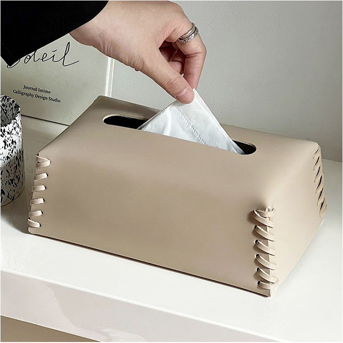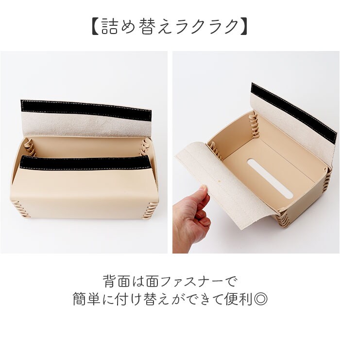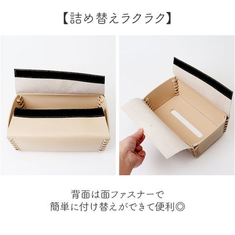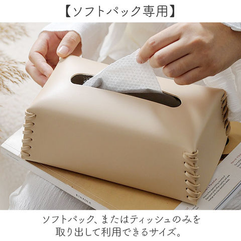 | 商品説明 | 【インテリアに馴染む】装飾のない洗練されたデザインが魅力的なティッシュケース。【高級感のある見た目】職人による手縫いで仕上げられた、美しいフォルムがポイント。【ソフトパック専用】ソフトパック、またはティッシュのみを取り出して利用できるサイズ。【詰め替えラクラク】背面は面ファスナーで簡単に付け替えができて便利◎【水と汚れに強い素材】お手入れのしやすいフェイクレザーを使用。軽量素材なので持ち運びもラクラク。 |