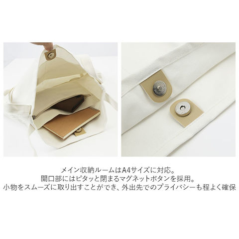 | 商品説明 | 長めのハンドルで、ゆったり肩掛けスタイル♪ナチュラルコーデにフィットする「キャンバストートバッグ」が新登場。コットンキャンバスの柔らかな生地感がデイリースタイルに優しく調和する、シンプルなショルダートート。メイン収納ルームはA4サイズに対応し、普段使いから通勤・通学用までマルチに使えるサイズ感。開口部にはピタッと閉まるマグネットボタンを採用。小物をスムーズに取り出すことができ、外出先でのプライバシーも程よく確保。メインルーム内側には、長財布サイズのオープンポケット×1、ファスナーポケット×1を配置し、散らかりがちな小物類もすっきり仕分けて収納可能。フロントの文庫本サイズのオープンポケットに、スマホやパスケースなど出番の多い小物を入れておくとサッと取り出せて便利。身体のラインに寄り添うようなマチの薄いスリムなフォルムで、スタイルを崩さずに持てるのが嬉しいポイント。2本の持ち手ハンドルは肩掛けにしやすい程よい長さ。両手がフリーになって持ち運びもスマートに。ベージュ色のコットン生地にプリントされた「FUN WITH FACES DAILY DRAWING PROMPTS」のメッセージタグがデザインのワンポイント。 |
