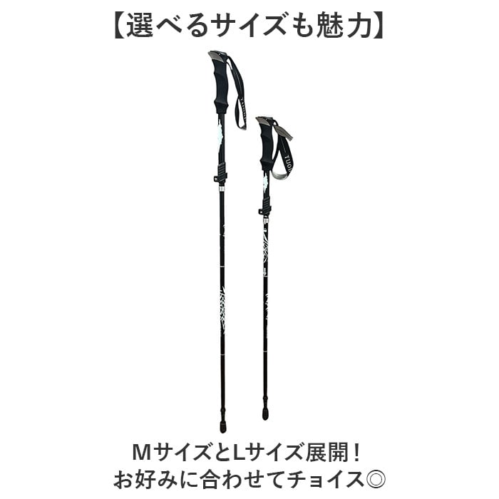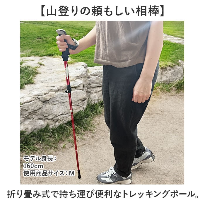 | 商品説明 | 【山登りの頼もしい相棒】折り畳み式で持ち運び便利なトレッキングポール。【組み立て簡単】畳んだ状態からポールをはめて、金属製押しボタンが出てくるまで引っ張って使用。【身長に合わせて長さ調節】レバーロックを外すだけで20cm伸縮自在の使いやすさ〇【折り畳んで楽々携帯】コンパクトに畳んでリュックにすっきり収まる便利さ♪【手にフィットする持ち手】触り心地の良いハンドルとストラップで安心して使える。【選べるサイズも魅力】MサイズとLサイズ展開!お好みに合わせてチョイス◎([Mサイズ]約95cm~約110cm、[Lサイズ]約110cm~約130cm) |