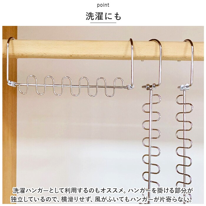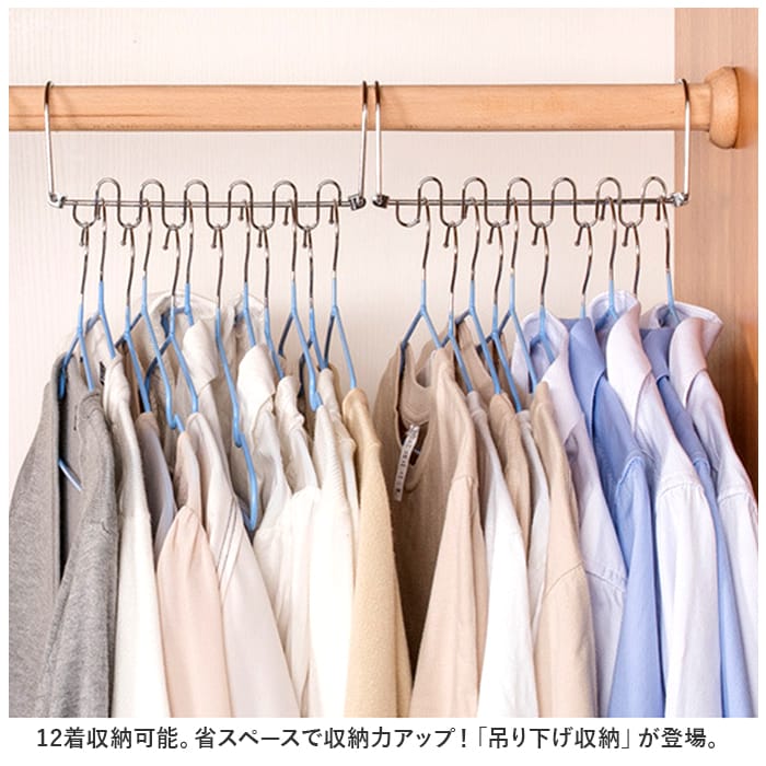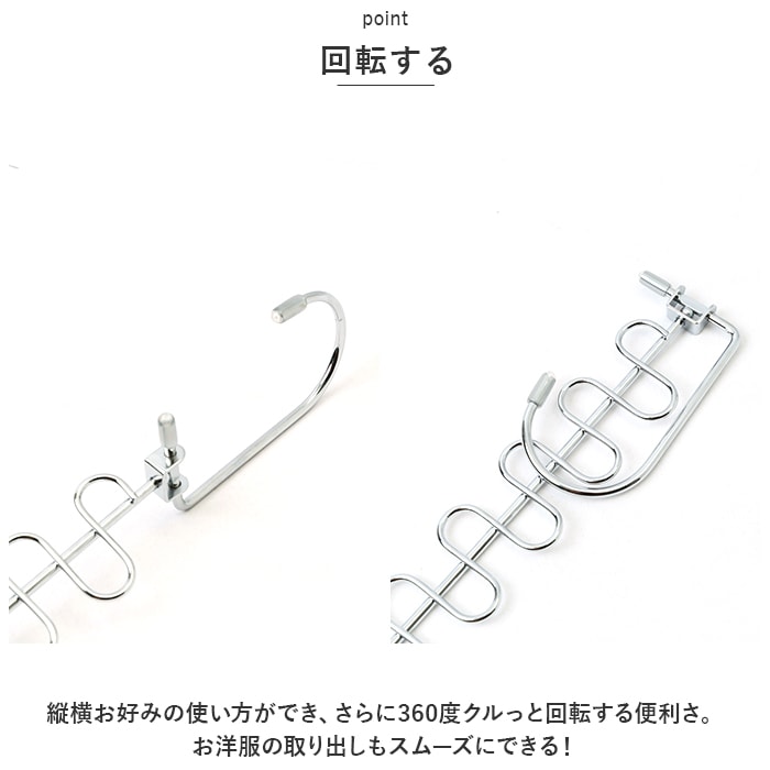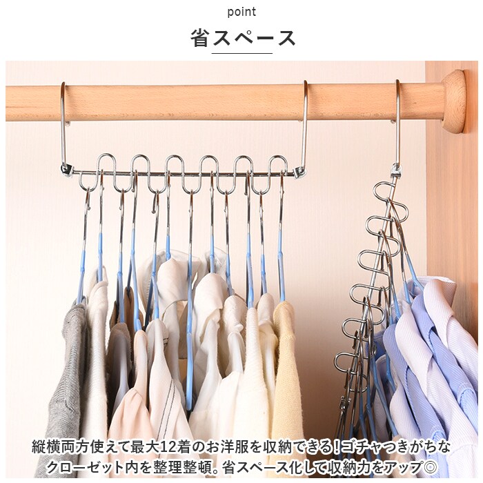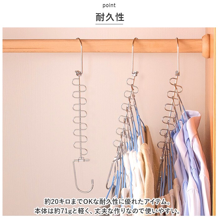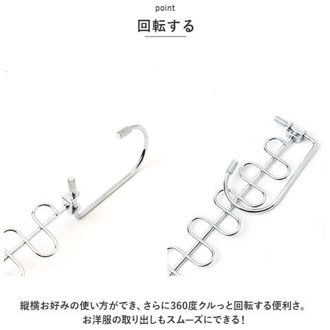 商品説明・12着収納可能。省スペースで収納力アップ!「吊り下げ収納」が登場。【省スペース】縦横両方使えて最大12着のお洋服を収納できる!ゴチャつきがちなクローゼット内を整理整頓。省スペース化して収納力をアップ◎【耐久性】約20キロまでOKな耐久性に優れたアイテム。本体は約71gと軽く、丈夫な作りなので使いやすい。【回転する】縦横お好みの使い方ができ、さらに360度クルっと回転する便利さ。お洋服の取り出しもスムーズにできる!【洗濯にも】洗濯ハンガーとして利用するのもオススメ。ハンガーを掛ける部分が独立しているので、横滑りせず、風がふいてもハンガーが片寄らない。【幅広く使える】幅広いアイテムを収納することができる。シャツ、パンツ、ジャケット、ネクタイやスカーフなど。幅広く収納できる。