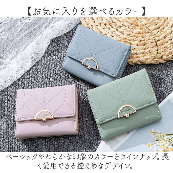 | 商品説明 | 【毎日持ち歩ける万能アイテム】シーンを問わず活躍◎上品な可愛さで、程よい収納力もある「レディース用三つ折り財布」。【大人女子にぴったりなデザイン】ソフトな風合いのPUレザーに、型押しデザイン。ゴールドの金具使いもアクセント。【スマートに持ち運べて使い勝手抜群】必要な物がすっきりまとまる、三つ折り仕様。小さめのバッグにもすっぽりIN。【いつでもどこでも開け閉め簡単】開口部はスナップボタン式。いつでもサッと開け閉めでき、飛び出しをガード。【ガバっと開く独立型小銭入れ】外側に配置された小銭入れ。スムーズに開くがま口タイプで、お会計時も手間取らない♪【お札もカード類もしっかり収納】お札入れに、カード類が入る複数のポケット。使い勝手の良いシンプル設計。【お気に入りを選べるカラー】ベーシックやわらかな印象のカラーをラインナップ。長く愛用できる控えめなデザイン。【ポケット仕様】外側:がま口式小銭入れ×1内側:お札入れ×1、カードポケット×5、フリーポケット×2 |