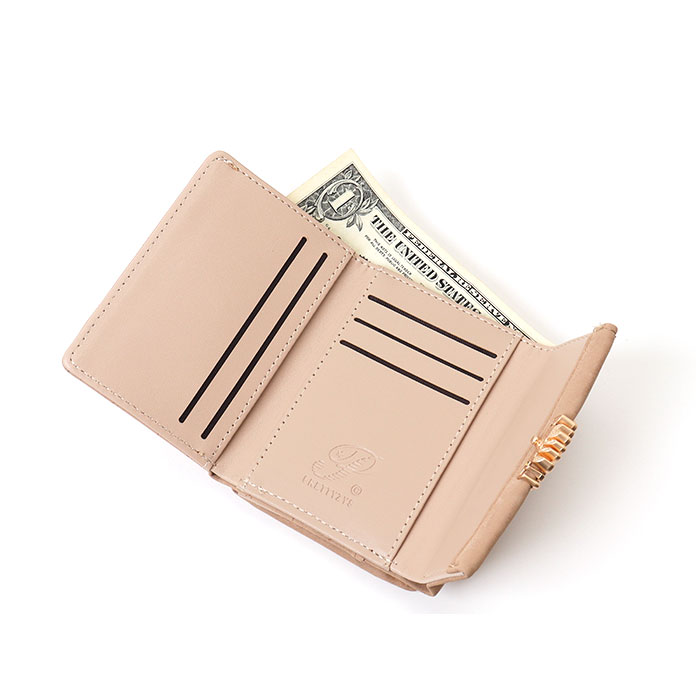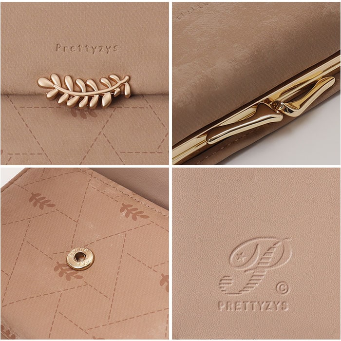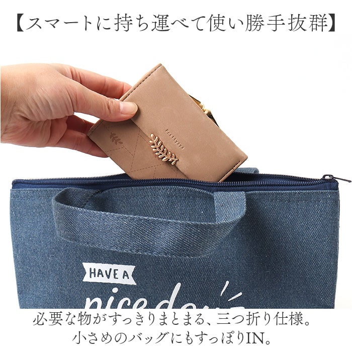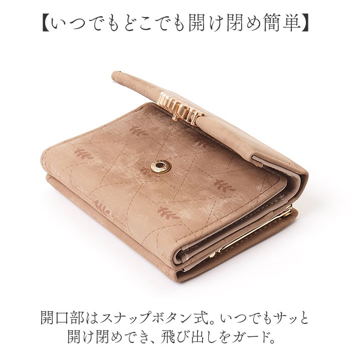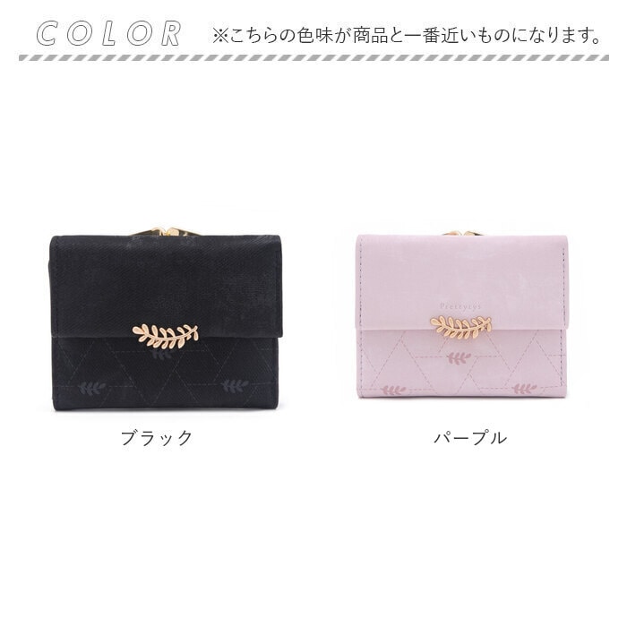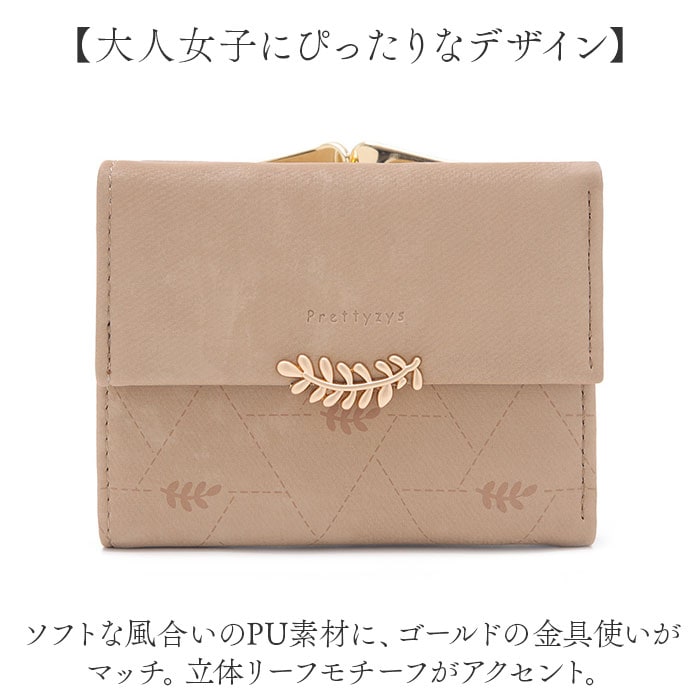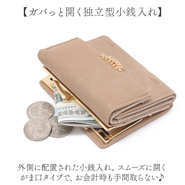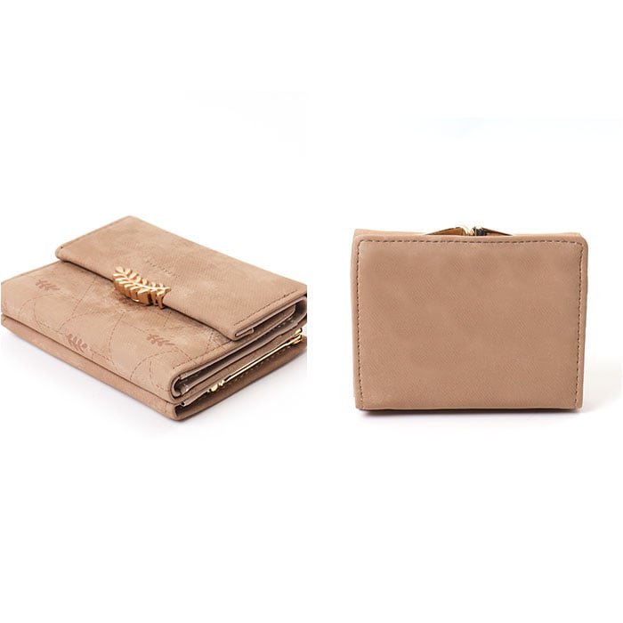 | 商品説明 | 【毎日持ち歩ける万能アイテム】シーンを問わず活躍◎上品な可愛さで、程よい収納力もある「三つ折り財布」。【大人女子にぴったりなデザイン】ソフトな風合いのPU素材に、ゴールドの金具使いがマッチ。立体リーフモチーフがアクセント。【スマートに持ち運べて使い勝手抜群】必要な物がすっきりまとまる、三つ折り仕様。小さめのバッグにもすっぽりIN。【ガバっと開く独立型小銭入れ】外側に配置された小銭入れ。スムーズに開くがま口タイプで、お会計時も手間取らない♪【いつでもどこでも開け閉め簡単】開口部はスナップボタン式。いつでもサッと開け閉めでき、飛び出しをガード。【お札もカード類もしっかり収納】お札入れに、カード類が入る複数のポケット。使い勝手の良いシンプル設計。【お気に入りを選べるカラー】ベーシックや柔らかな印象のカラーをラインナップ。長く愛用できる控えめなデザイン。【ポケット仕様】外側:がま口式小銭入れ×1内側:お札入れ×1、カードポケット×4、フリーポケット×2 |