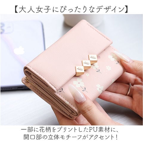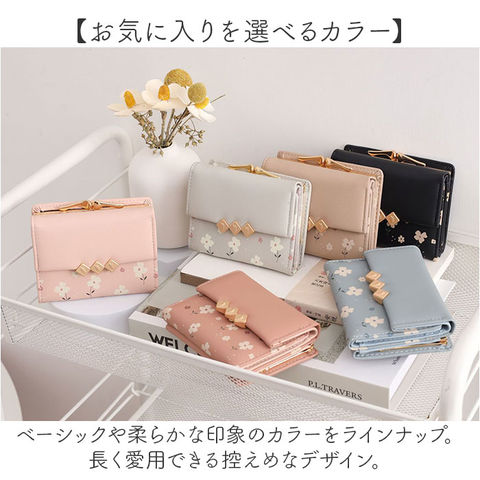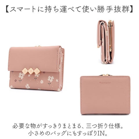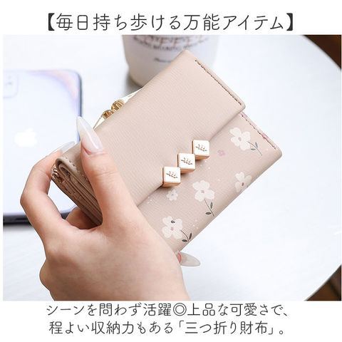 | 商品説明 | 【毎日持ち歩ける万能アイテム】シーンを問わず活躍◎上品な可愛さで、程よい収納力もある「三つ折り財布」。【大人女子にぴったりなデザイン】一部に花柄をプリントしたPU素材に、開口部の立体モチーフがアクセント!【スマートに持ち運べて使い勝手抜群】必要な物がすっきりまとまる、三つ折り仕様。小さめのバッグにもすっぽりIN。【ガバっと開く独立型小銭入れ】外側に配置された小銭入れ。スムーズに開くがま口タイプで、お会計時も手間取らない♪【いつでもどこでも開け閉め簡単】開口部はスナップボタン式。いつでもサッと開け閉めでき、飛び出しをガード。【お札もカード類もしっかり収納】お札入れに、カード類が入る複数のポケット。使い勝手の良いシンプル設計。【お気に入りを選べるカラー】ベーシックや柔らかな印象のカラーをラインナップ。長く愛用できる控えめなデザイン。【ポケット仕様】外側:がま口式小銭入れ×1内側:お札入れ×1、カードポケット×4、フリーポケット×2 |