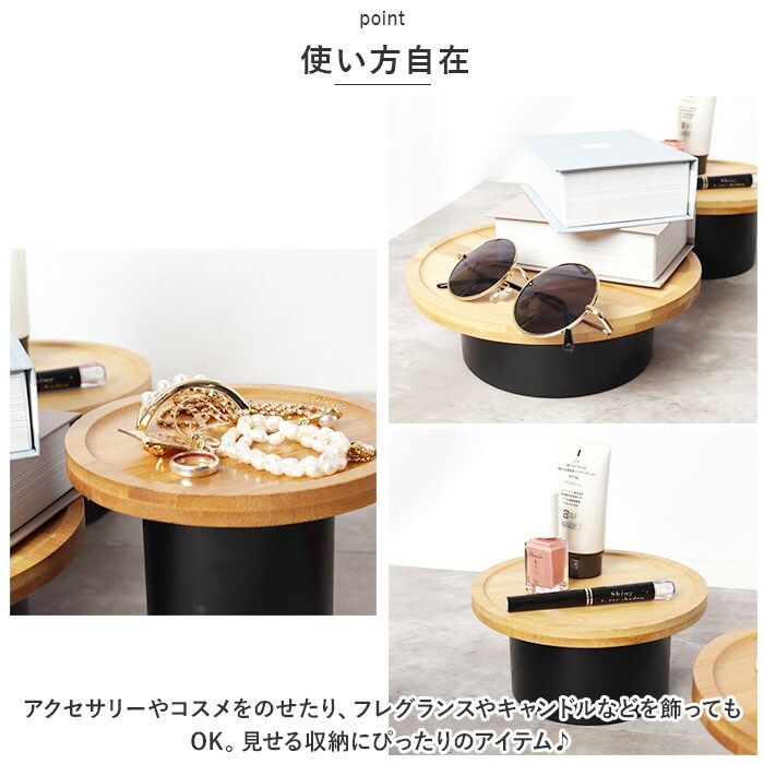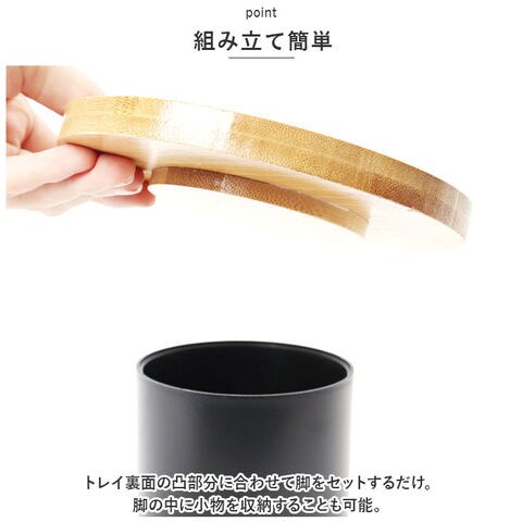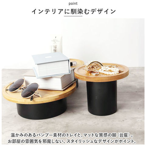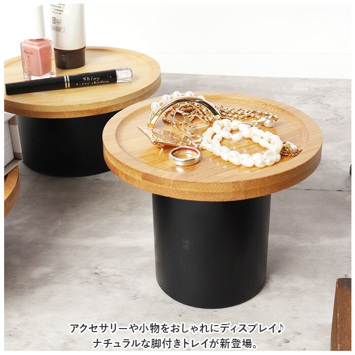 | 商品説明 | アクセサリーや小物をおしゃれにディスプレイ♪ナチュラルな脚付きトレイが新登場。【インテリアに馴染むデザイン】温かみのあるバンブー素材のトレイと、マットな質感の脚(台座)。お部屋の雰囲気を邪魔しない、スタイリッシュなデザインがポイント。【使い方自在】アクセサリーやコスメをのせたり、フレグランスやキャンダルなどを飾ってもOK。見せる収納にぴったりのアイテム♪【組み立て簡単】トレイ裏面の凸部分に合わせて脚をセットするだけ。脚の中に小物を収納することも可能。【お好みでチョイス】落ち着きのあるモノトーンの2カラー。飾る小物や置き場所に合わせて選べる3つのサイズをラインナップ! |