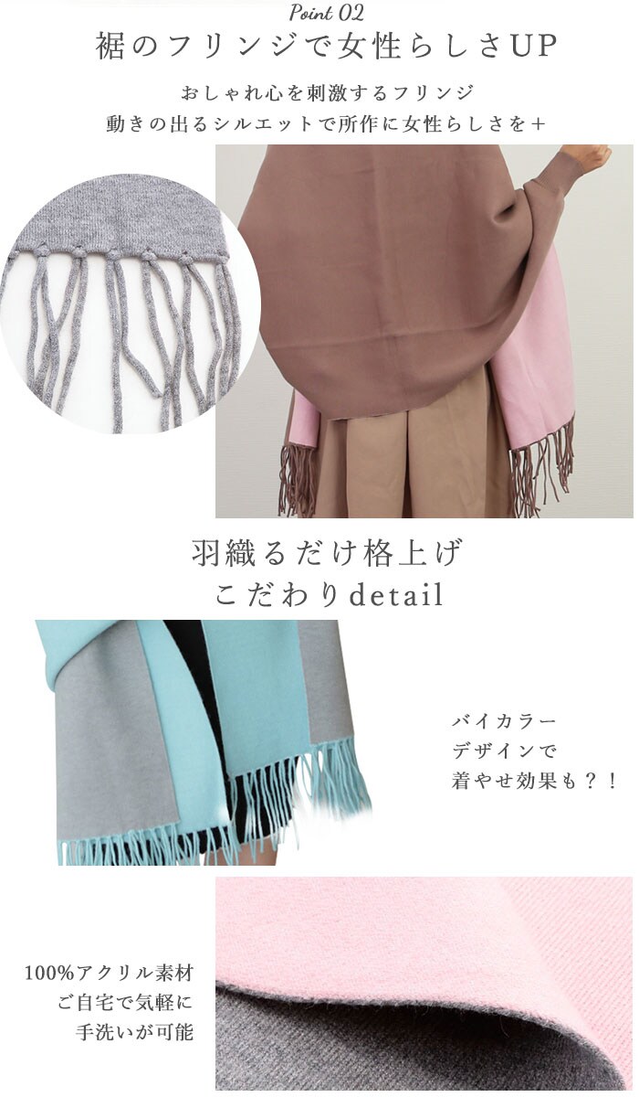 | 商品説明 | もうズレ落ち気にならない♪肌寒い季節にふんわりと羽織れる、袖付きあったかストールカーディガン。網目の細かい滑らかな肌触りのニット生地で、毛羽立ちも少なくサラリと羽織れる♪程よい厚みの生地で、着ぶくれせずにスッキリと着こなせるのにしっかり暖かい。裾に長めのフリンジのあるデザインで、華やかで動きのある印象に。腰回りやヒップのラインをふんわりと包みこんで、身体のラインをさりげなくカバー♪肩や手首にピッタリとフィットする袖付きストールだから、風の強い日でも、ズレ落ちないように手で押さえる手間がなくラクチン。表地と裏地でカラーを切り替えたおしゃれなバイカラーのデザイン。ゆったり目に羽織ったり、裾が翻るたびに表情が変化して、ファッションに自分色をプラス出来る♪サッと羽織って近所にお出かけする時はもちろん、オフィスやカフェで肌寒い時にカーディガン感覚で着るのにもちょうどいい。無地だからスーツやキレイめスタイルとの相性もばっちり。100%アクリル素材で、ご自宅で気軽に手洗いが可能。お手入れも手間いらず♪袖が付いている側を下にしてストールを広げ、肩口に掛けてから袖に手を通せばスムーズに着用できる! |
