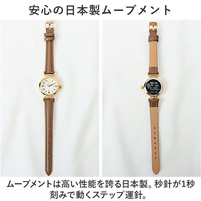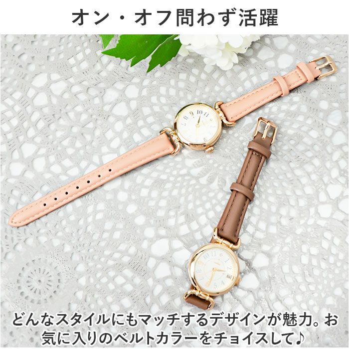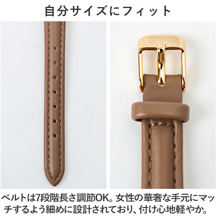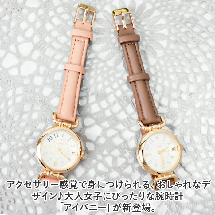 | 商品説明 | アクセサリー感覚で身につけられる、おしゃれなデザイン♪大人女子にぴったりな腕時計「アイバニー」が新登場。【アンティーク感のある仕上がり】どこか懐かしくも上品さを残したアイテム。程よく存在感のある文字盤や、ベルトと文字盤をつなぐパーツデザインがポイント。【こだわりの文字盤】ゴールド&シルバーカラーの数字や、12時の位置に配置されたストーンがキラッと輝く☆文字盤ケース横のつまみで、簡単に時刻調節が可能。【便利なデイト表示機能】・3時の位置に配置された小窓で日付を確認OK。ビジネスシーンでも重宝。【自分サイズにフィット】ベルトは7段階長さ調節OK。女性の華奢な手元にマッチするよう細めに設計されており、付け心地軽やか。【安心の日本製ムーブメント】ムーブメントは高い性能を誇る日本製。秒針が1秒刻みで動くステップ運針。【オン・オフ問わず活躍】どんなスタイルにもマッチするデザインが魅力。お気に入りのベルトカラーをチョイスして♪ |