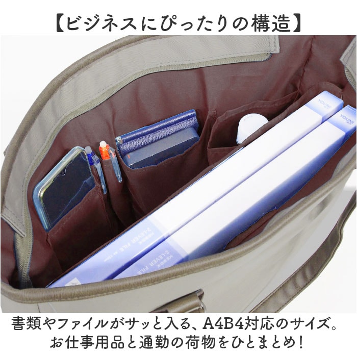 商品説明【ビジネスをもっと快適に!】PCやモバイル周辺機器をすっきり収納◎ソフトビジネストートが登場。【ビジネスにぴったりの構造】書類やファイルがサッと入る、A4B4対応のサイズ。お仕事用品と通勤の荷物をひとまとめ!【クッションINのPCポケットつき】PCやタブレットの持ち運びにぴったりなクッションINポケットを搭載。持ち運びも安心。【モバイル機器や小物を整頓!】ペットボトルや傘を立てて収納できるホルダーや、小物ポケットを多数配置した高機能バッグ。【スリムでスタイリッシュ☆】スーツスタイルにマッチする、洗練されたシンプルさが魅力。スリムなので女性らしい印象に。【ソフト&軽量タイプ◎】かっちりしすぎない、扱いやすいソフトタイプのバッグ。持ち運びがしやすい軽量化を実現。【ポケット仕様】メイン:PCポケット×1、オープンポケット×2、ペンポケット×2、ボトルホルダー×1フロント:マグネットボタンポケット×1背面:ファスナーポケット×1