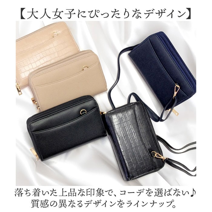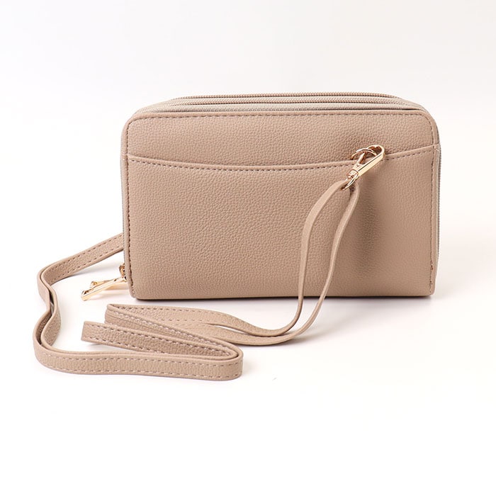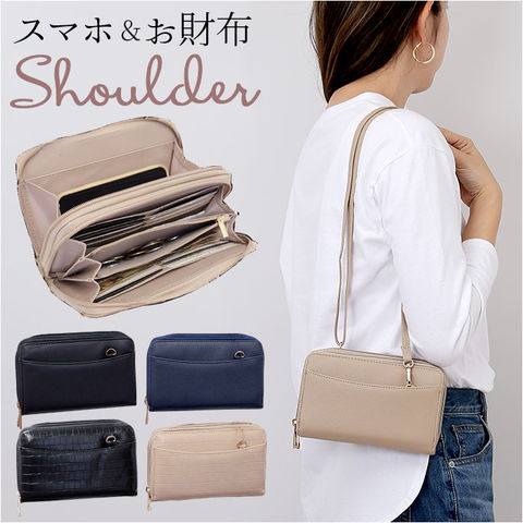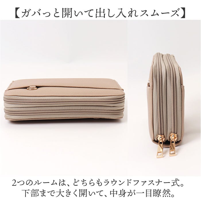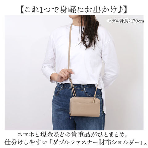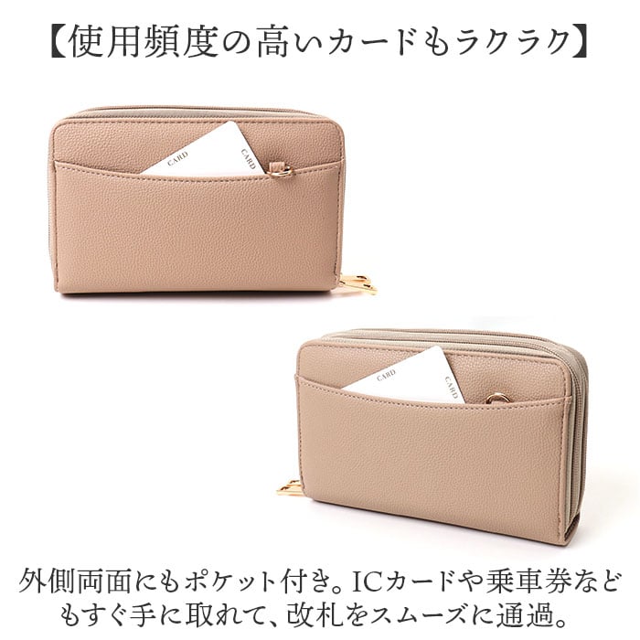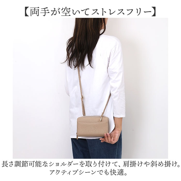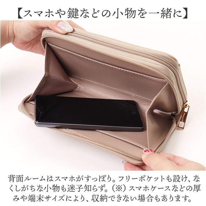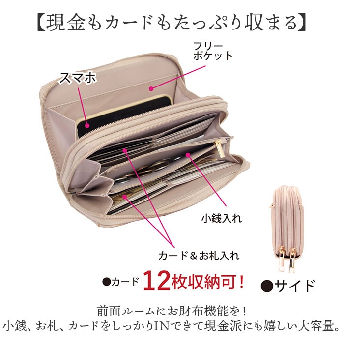 | 商品説明 | 【これ1つで身軽にお出かけ♪】スマホと現金などの貴重品がひとまとめ。仕分けしやすい「ダブルファスナー財布ショルダー」。【すっきり整頓できるダブルルーム】ファスナー式ルームを2つ配置。スマホ&小物と現金&カードを分けて収納できる◎【ガバっと開いて出し入れスムーズ】・2つのルームは、どちらもラウンドファスナー式。下部まで大きく開いて、中身が一目瞭然。【現金もカードもたっぷり収まる】前面ルームにお財布機能を!小銭、お札、カードをしっかりINできて現金派にも嬉しい大容量。【スマホや鍵などの小物を一緒に】背面ルームはスマホがすっぽり。フリーポケットも設け、なくしがちな小物も迷子知らず。(※)スマホケースなどの厚みや端末サイズにより、収納できない場合もあります。【使用頻度の高いカードもラクラク】外側両面にもポケット付き。ICカードや乗車券などもすぐ手に取れて、改札をスムーズに通過。【両手が空いてストレスフリー】長さ調節可能なショルダーを取り付けて、肩掛けや斜め掛け。アクティブシーンでも快適。【大人女子にぴったりなデザイン】落ち着いた上品な印象で、コーデを選ばない♪質感の異なるデザインをラインナップ。【ポケット仕様】前面ルーム:ファスナー式小銭入れ×1、フリーポケット×4、カードポケット×12背面ルーム:フリーポケット×2外側:フリーポケット×2 |