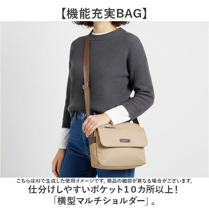 | 商品説明 | 【機能充実BAG】仕分けしやすいポケット10カ所以上!「横型マルチショルダー」。【便利な財布機能】背面のガバっと開くファスナーポケットはジャバラ式の5層構造で、8枚入るカード収納付き!【ファスナー式のメイン収納】500mlのペットボトルが横に入り、オープンポケット2つ付き◎【最前面のファスナーポケット】浅めのポケットにはペンや文房具などが入れられる♪【前面マグネット開閉式】フラップを開けると、オープンポケットを装備。小物の整理整頓に〇【軽やかな使い心地】サッと持ち出せるコンパクトさと軽さで、長時間のお出かけも疲れにくい。【自由に長さ調整】調節可能なショルダーベルトで、斜めがけも肩掛けも自分好みのスタイルに対応。【自立型】マチがあるので自立し、床やテーブルに置いた時も倒れにくい。 |