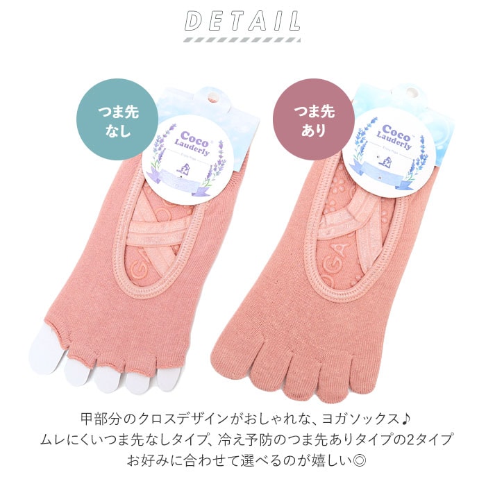 | 商品説明 | 甲部分のクロスデザインがおしゃれな、ヨガソックス♪つま先を動かしやすい5本指靴下。しっかりと地面をとらえ、ヨガのポージングに大切な姿勢とバランスを保つことができる♪甲部分が開いたデザインで、ムレにくく快適。足裏部分に滑り止め付き。フローリングでも安心してエクササイズできちゃう◎冷え予防のつま先ありタイプ、ムレにくいつま先なしタイプの2タイプ。お好みに合わせて選べるのが嬉しい◎ |