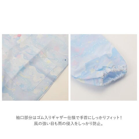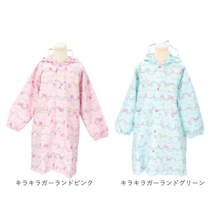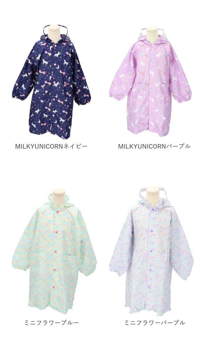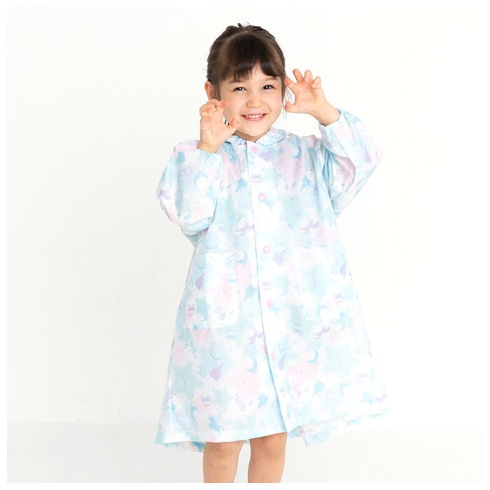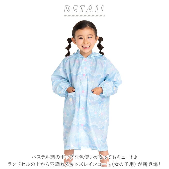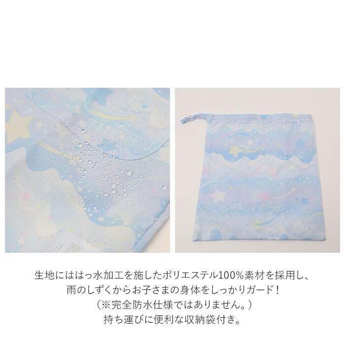 | 商品説明 | パステル調のポップな色使いがとってもキュート♪ランドセルの上から羽織れるキッズレインコート(女の子用)が新登場!軽い着心地のコート生地にははっ水加工を施したポリエステル100%素材を採用し、雨のしずくからお子さまの身体をしっかりガード!(※完全防水仕様ではありません。)フードのひさし部分に広めの透明窓をデザインし、前方・左右まで視野が妨げられない安心設計。コート背中には、スナップボタンを外して広がる「ランドセルタック」付き。ランドセルやリュックを背負ったままでもすっぽりと着用可能。自動車のライトにピカッと光る☆背中のタック部分にはハート型のリフレクター素材が付いているので、薄暗い雨の日でも安心♪前合わせは、お子さまご自身でパチンッと簡単に留められるスナップボタンタイプ。袖口部分はゴム入りギャザー仕様で手首にしっかりフィット!風の強い日も雨の侵入をしっかり防止。袖の下、両脇部分に蒸し暑い時期でも快適な通気口を配置。さらに、厚着をする季節でも肩や腕がもたつかないラグラン袖のデザインにすることで、オールシーズン軽い着心地をキープ。前開き裏側部分にはお名前を記入できるネームタグ付き。お友達とお揃いでもコートを取り違える心配のない嬉しい仕様。ユニコーンや星形モチーフをパステルタッチで描きだした、オシャレなガールズにオススメのゆめかわデザイン。持ち運びに便利な収納袋付き。 |