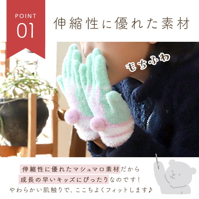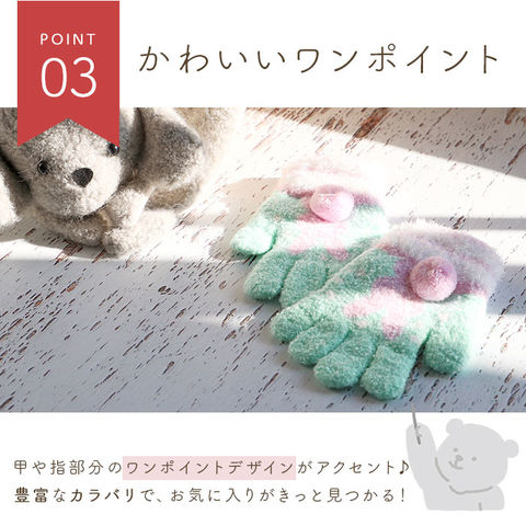 | 商品説明 | 可愛いワンポイント付き♪おしゃれなキッズ手袋が登場。伸縮性に優れたマシュマロ素材を採用!成長の早いキッズにぴったり◎柔らかい肌触りで、手に心地よくフィット!甲や指部分のワンポイントデザインがアクセント♪(※種類によりワンポイントのデザインや位置が異なります。)安心の日本製。寒い季節の必須アイテム◎ |