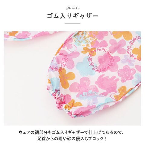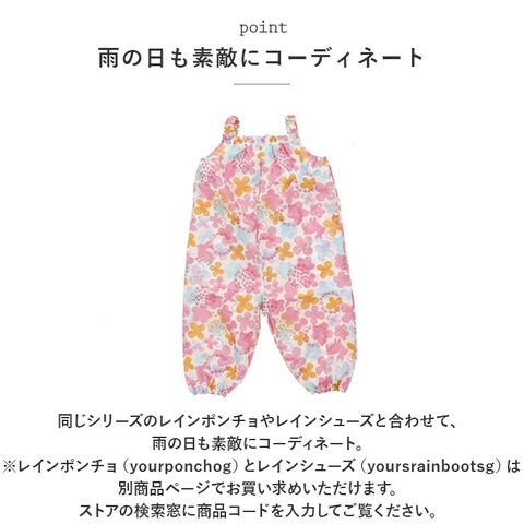 | 商品説明 | 雨の日のお出掛けやお砂場遊びに大活躍!パステルカラーが可愛い「ガールズ用・キッズプレイウェア」が新登場。胸元までしっかりと覆ってお洋服が汚れにくい、安心のオーバーオールタイプ。ぐーんと伸びるゴム入りの肩ひもで、お着換え楽ちん。身幅たっぷりの設計で動きやすく、ママが簡単に着させてあげられるのも嬉しいポイント。幼稚園のスモックとは違い、ウェアの裾部分もゴム入りギャザーで仕上げてあるので、足首からの雨や砂の侵入もブロック!プレイウェアの生地と同じ柄の巾着袋付き!ママのカバンに入れておけば、急な雨のときや、お出掛け先でお子さまが公園で遊びたくなったときでもサッと取り出せる♪雨の水滴や泥んこ汚れに強い、はっ水加工ポリエステル生地を使用しているので、雨の日はレインパンツとしても使えて便利。同じシリーズのレインポンチョやレインシューズと合わせて、雨の日も素敵にコーディネート。(※レインポンチョ(yourponchog)とレインシューズ(yoursrainbootsg)は、別商品ページでお買い求めいただけます。ストアの検索窓に商品コードを入力してご覧ください。)パステルタッチで描きだした、女の子らしいゆめかわデザインで公園遊びがもっと楽しく♪ |