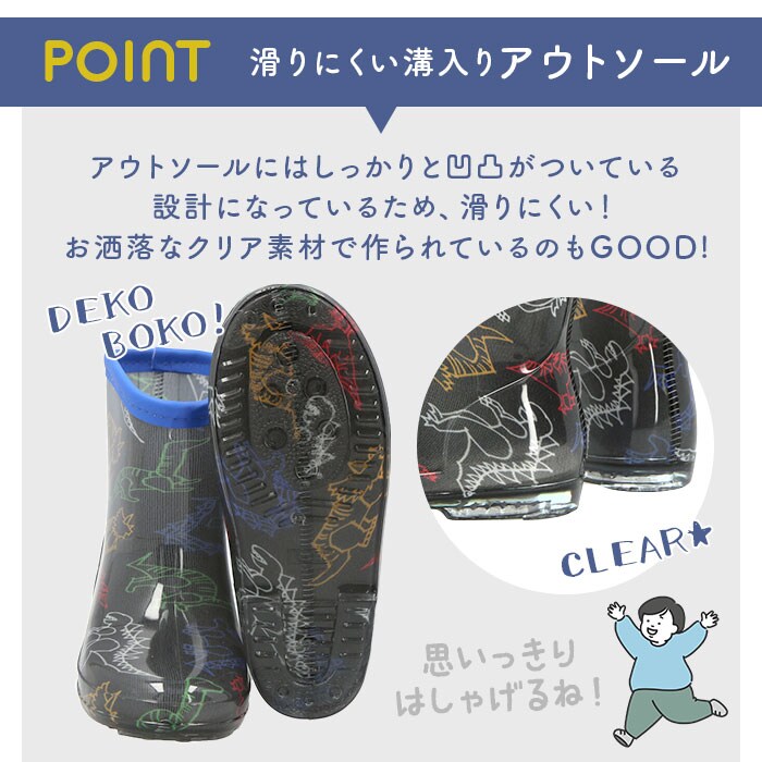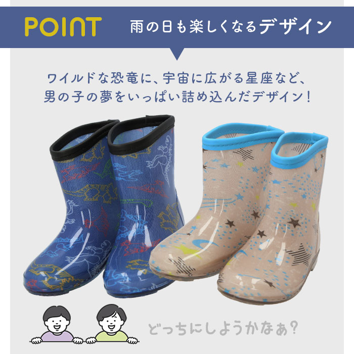 | 商品説明 | ボーイズの冒険心をくすぐるCOOLなデザイン♪キッズレインブーツが新登場。ワイルドな恐竜に、宇宙に広がる星座など、男の子の夢をいっぱい詰め込んだレインブーツ。お子さま一人でもサッと履きやすく、動きやすいショート丈♪アウトソールにはお洒落なクリア素材を使用。しっかりと凹凸があり、濡れた場所でも滑りにくい。中敷は取り外しができ、お手入れやサイズの微調整がしやすい作りに。内側はさらっとした肌あたりで脱ぎ履きもスムーズ!憂鬱な雨の日のお出かけも楽しくなるアイテム。 |