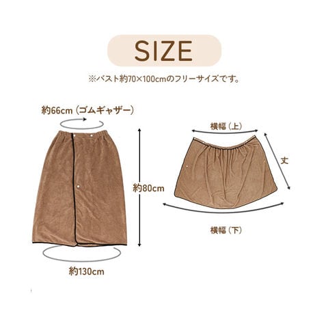 | 商品説明 | お風呂上りにパッと巻いて、ホッとリラックス。たっぷり大判サイズのラップタオル。ふわふわのパイル生地が肌に優しく馴染んで、ご自宅でのバスタイムはもちろん、温泉旅行などのレジャーにも最適。ウエストはゴムのギャザーと、2段階に調節できるスナップボタンでタオルが身体にぴったりフィット!タオルがストンと落ちてしまう心配がなく安心。吸水性と速乾性に優れたマイクロファイバー素材を使用。80cm×130cmの大判サイズで身体をすっぽり包み込んで、簡単タオルドライ。ご自宅用だけでなく、学校のプール学習の際の着替え用など、お子様用にもオススメ。ラグジュアリー感のあるくすみカラーのバリエーションで、リラックスタイムを素敵に演出。 |