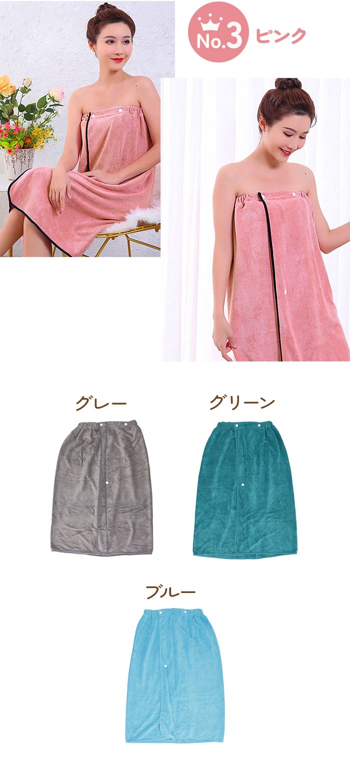 | 商品説明 | お風呂上りにパッと巻いて、ホッとリラックス。たっぷり大判サイズのラップタオル。ふわふわのパイル生地が肌に優しく馴染んで、ご自宅でのバスタイムはもちろん、温泉旅行などのレジャーにも最適。ウエストはゴムのギャザーと、2段階に調節できるスナップボタンでタオルが身体にぴったりフィット!タオルがストンと落ちてしまう心配がなく安心。吸水性と速乾性に優れたマイクロファイバー素材を使用。80cm×130cmの大判サイズで身体をすっぽり包み込んで、簡単タオルドライ。ご自宅用だけでなく、学校のプール学習の際の着替え用など、お子様用にもオススメ。ラグジュアリー感のあるくすみカラーのバリエーションで、リラックスタイムを素敵に演出。 |