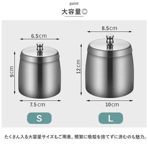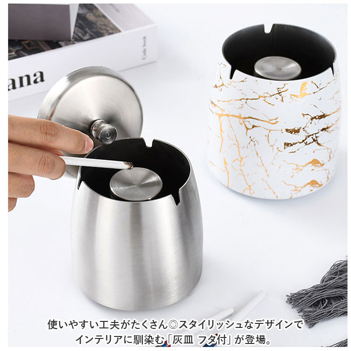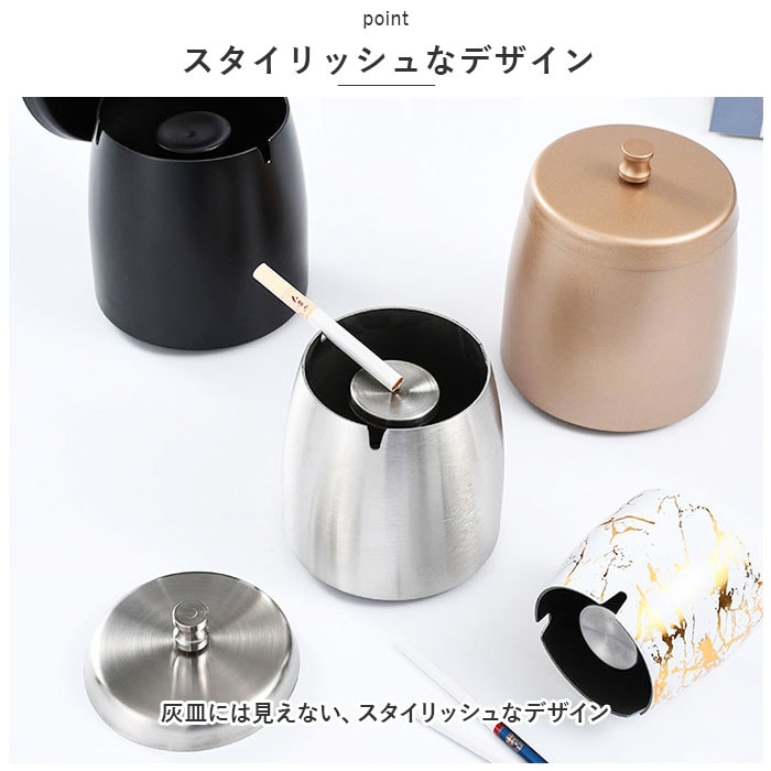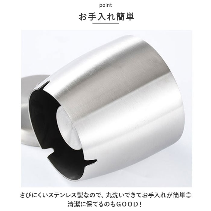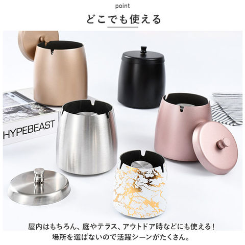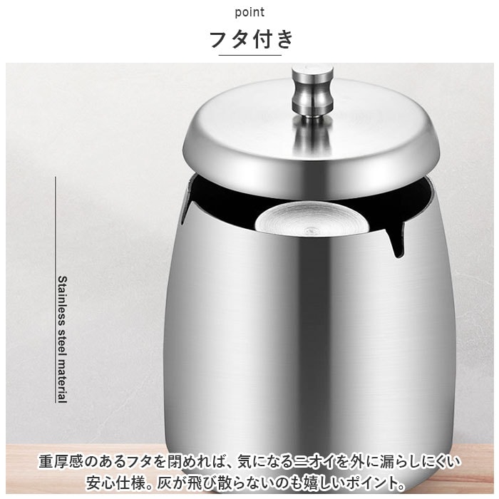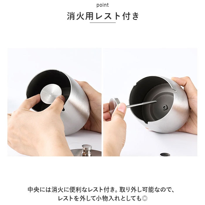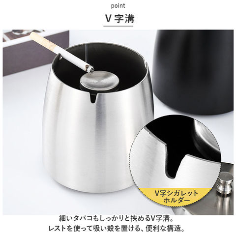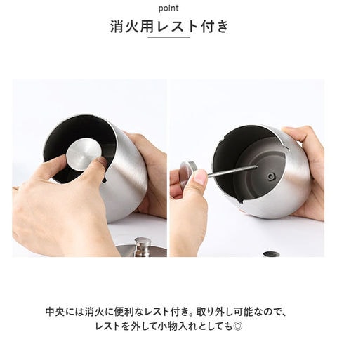 | 商品説明 | 使いやすい工夫がたくさん◎スタイリッシュなデザインでインテリアに馴染む「灰皿 フタ付」が登場。【フタ付き】重厚感のあるフタを閉めれば、気になるニオイを外に漏らしにくい安心仕様。灰が飛び散らないのも嬉しいポイント。【消火用レスト付き】中央には消火に便利なレスト付き。取り外し可能なので、レストを外して小物入れとしても◎【V字溝】細いタバコもしっかりと挟めるV字溝。レストを使って吸い殻を置ける、便利な構造。【お手入れ簡単】さびにくいステンレス製なので、丸洗いできてお手入れが簡単◎清潔に保てるのもGOOD!【どこでも使える】屋内はもちろん、庭やテラス、アウトドア時などにも使える!場所を選ばないので活躍シーンがたくさん。【大容量◎】たくさん入る大容量サイズもご用意。頻繁に吸殻を捨てずに済むのも魅力。【IQOS(アイコス)も】IQOS(アイコス)の吸い殻入れとしても使用OK。愛煙家なら誰でも使えるアイテム。【スタイリッシュなデザイン】灰皿には見えない、スタイリッシュなデザイ |