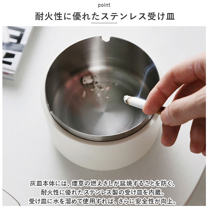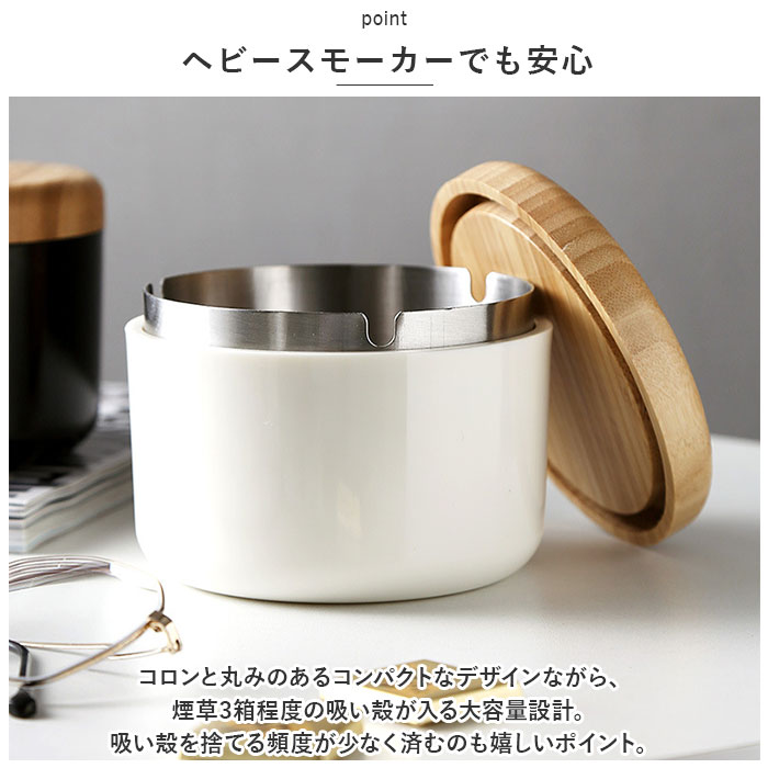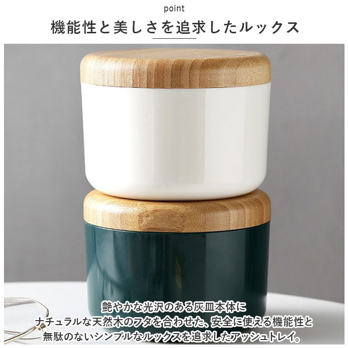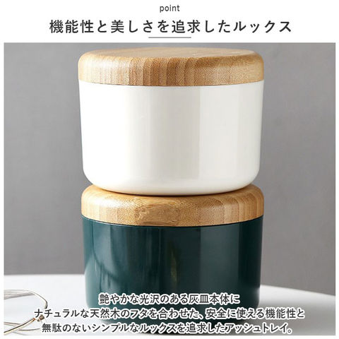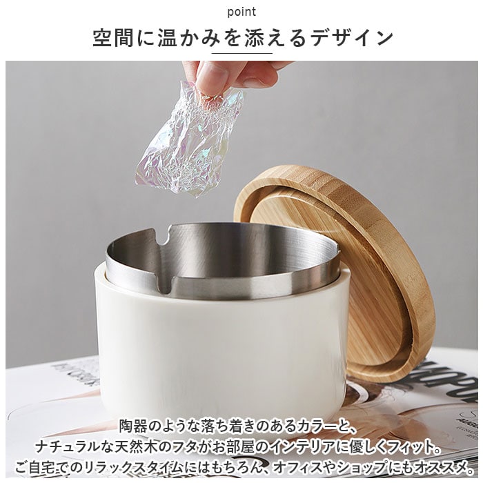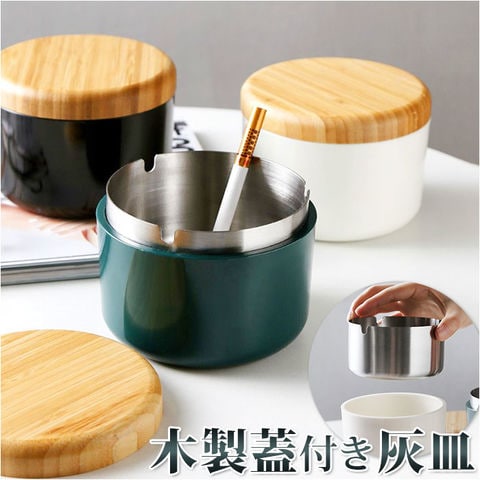 | 商品説明 | 紫煙をくゆらすひと時に、清潔感と安心感をプラス!インテリアにスッキリと馴染む「木製フタつき灰皿」が新登場。【機能性と美しさを追求したルックス】艶やかな光沢のある灰皿本体にナチュラルな天然木のフタを合わせた、安全に使える機能性と無駄のないシンプルなルックスを追求したアッシュトレイ。【耐火性に優れたステンレス受け皿】灰皿本体には、煙草の燃えさしが延焼することを防ぐ、耐火性に優れたステンレス製の受け皿を内蔵。受け皿に水を溜めて使用すれば、さらに安全性が向上。【受け皿には便利なU字溝付き】受け皿のフチ3ヶ所にはU字溝を刻みこみ、吸い掛けのたばこを挟んだり、灰を落とすときに便利。風除け効果もあるので、屋外での一服にも最適。【木製のフタで清潔感をキープ】木製のフタが、ステンレス受け皿のフチにフィットしてしっかり密閉。吸い殻をカバーすることでニオイ漏れを防ぎ、すっきり清潔感のある見た目をキープ。【毎日のお手入れが楽ちん】間口の広い開口部で吸い殻がサッと捨てられるからお手入れも楽ちん。汚れが気になったら、ステンレスの受け皿を取り外して丸洗いもOK!【ヘビースモーカーでも安心】コロンと丸みのあるコンパクトなデザインながら、煙草3箱程度の吸い殻が入る大容量設計。吸い殻を捨てる頻度が少なく済むのも嬉しいポイント。【空間に温かみを添えるデザイン】陶器のような落ち着きのあるカラーと、ナチュラルな天然木のフタがお部屋のインテリアに優しくフィット。ご自宅でのリラックスタイムにはもちろん、オフィスやショップにもオススメ。 |