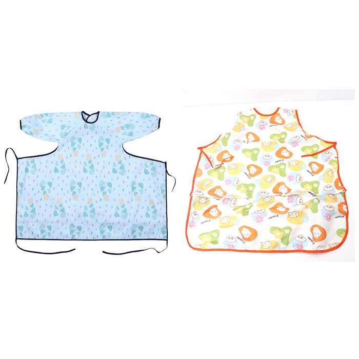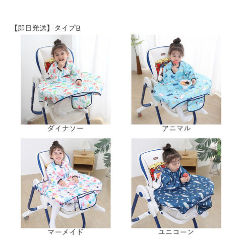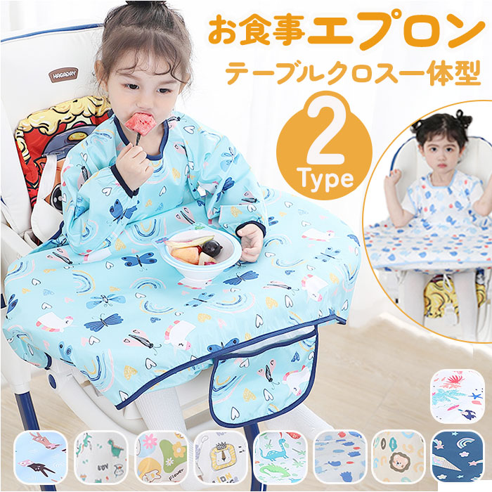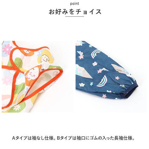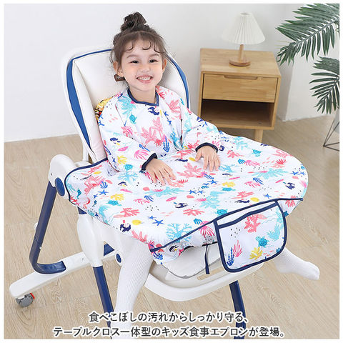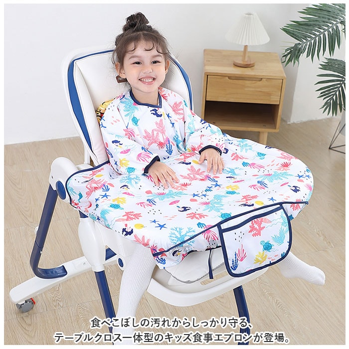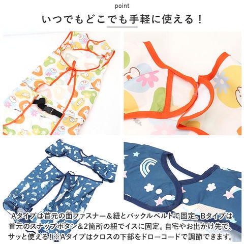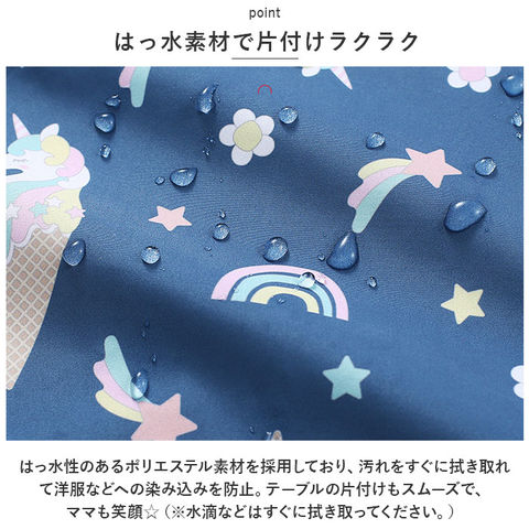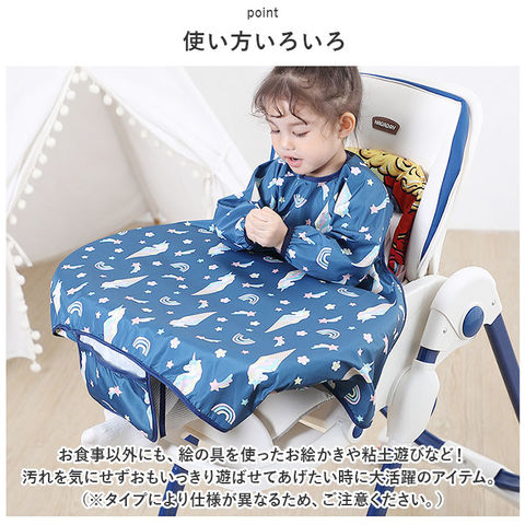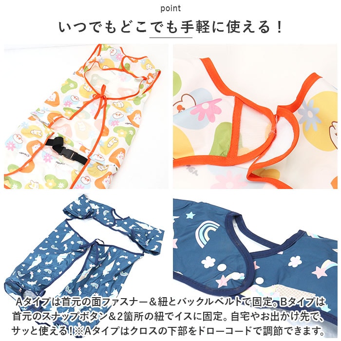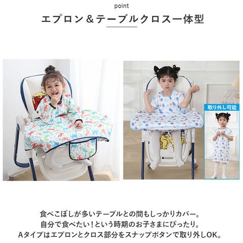 商品説明食べこぼしの汚れからしっかり守る、テーブルクロス一体型のキッズ食事エプロンが登場。【いつでもどこでも手軽に使える!】Aタイプは首元の面ファスナー&紐とバックルベルトで固定。Bタイプは首元のスナップボタン&2箇所の紐でイスに固定。自宅やお出かけ先で、サッと使える!(※Aタイプはクロスの下部をドローコードで調節できます。)【エプロン&テーブルクロス一体型】食べこぼしが多いテーブルとの間もしっかりカバー。自分で食べたい!という時期のお子さまにぴったり。Aタイプはエプロンとクロス部分をスナップボタンで取り外しOK。【はっ水素材で片付けラクラク】はっ水性のあるポリエステル素材を採用しており、汚れをすぐに拭き取れて洋服などへの染み込みを防止。テーブルの片付けもスムーズで、ママも笑顔☆(※水滴などはすぐに拭き取ってください。)【お好みをチョイス】Aタイプは袖なし仕様。Bタイプは袖口にゴムの入った長袖仕様。【持ち運びに便利】折りたためばコンパクトサイズになるので、お出かけ用のバッグにかさばることなく忍ばせられるのが嬉しい!Bタイプは下部のポケットに収納可能。【キュートでポップなデザイン】可愛らしいアニマル柄などをプリントした、カラフルデザイン。毎日のお食事が楽しくなりそう♪【使い方いろいろ】お食事以外にも、絵の具を使ったお絵かきや粘土遊びなど!汚れを気にせずおもいっきり遊ばせてあげたい時に大活躍のアイテム。(※タイプにより仕様が異なるため、ご注意ください。)