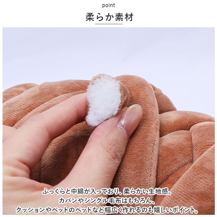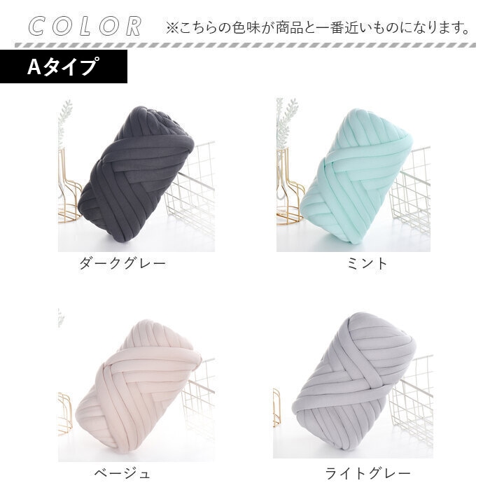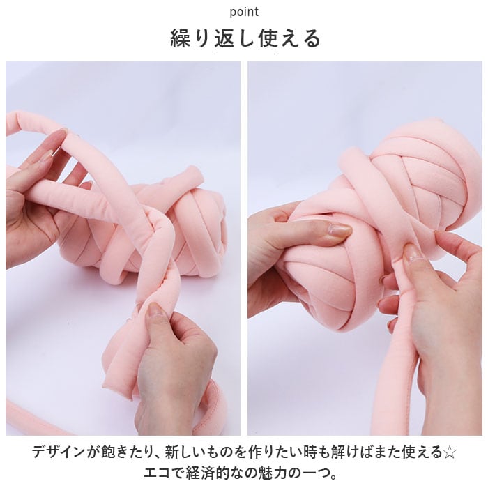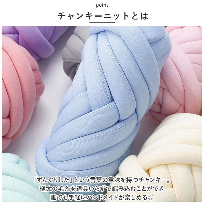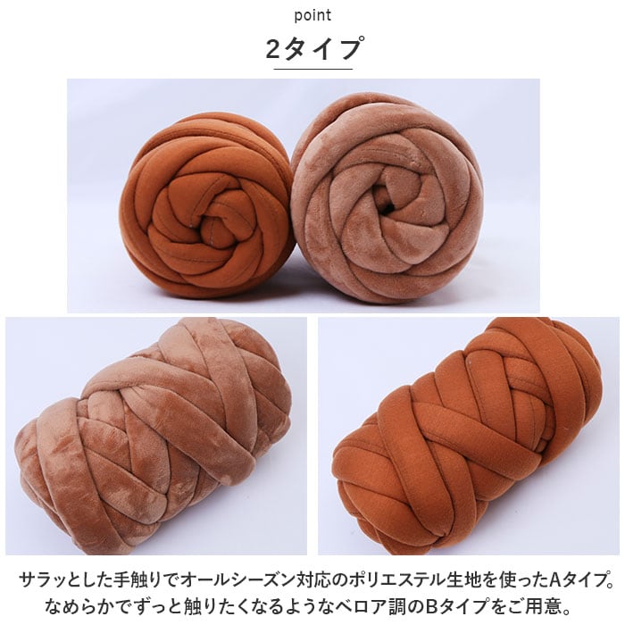 | 商品説明 | チャンキーニットにぴったり♪専用毛糸が発売!【チャンキーニットとは】「ずんぐりした」という言葉の意味を持つチャンキー。極太の毛糸を道具いらずで編み込むことができ誰でも手軽にハンドメイドが楽しめる◎【2タイプ】サラッとした手触りでオールシーズン対応のポリエステル生地を使ったAタイプ。なめらかでずっと触りたくなるようなベロア調のBタイプをご用意。【柔らか素材】ふっくらと中綿が入っており、柔らかい生地感。カバンやシングル毛布はもちろん、クッションやペットのベッドなど幅広く作れるのも嬉しいポイント。【洗濯可能】洗濯ネットに入れれば、洗濯機で丸洗いが可能◎汚れてもお手入れ楽チン!いつでも清潔に保てる。【繰り返し使える】デザインが飽きたり、新しいものを作りたい時も解けばまた使える☆エコで経済的なの魅力の一つ。 |