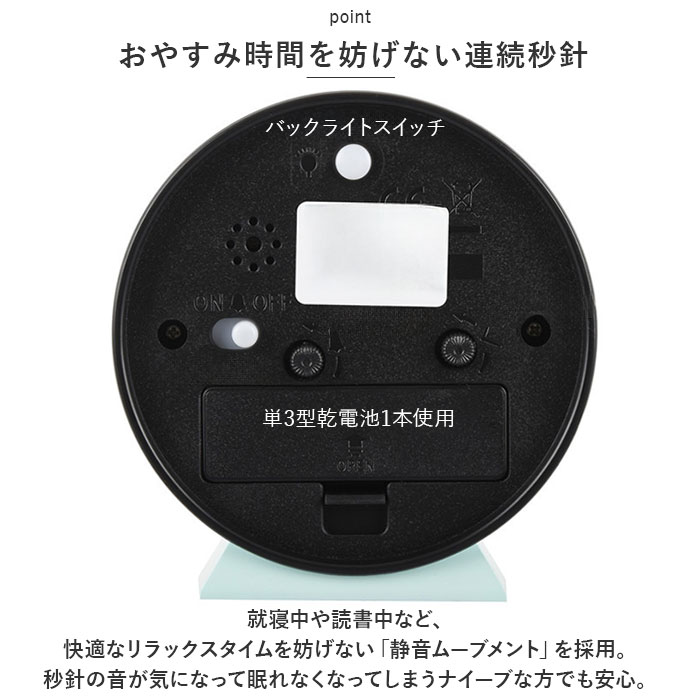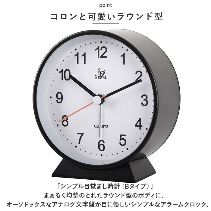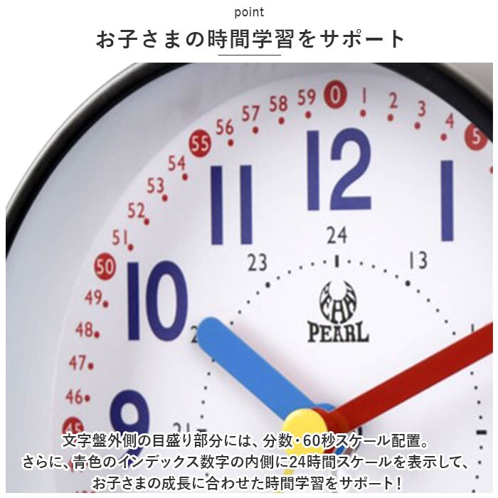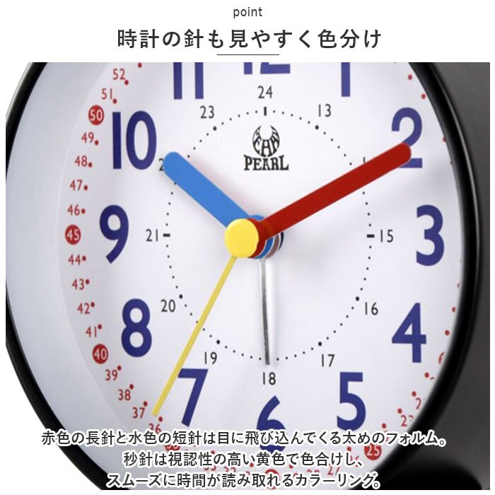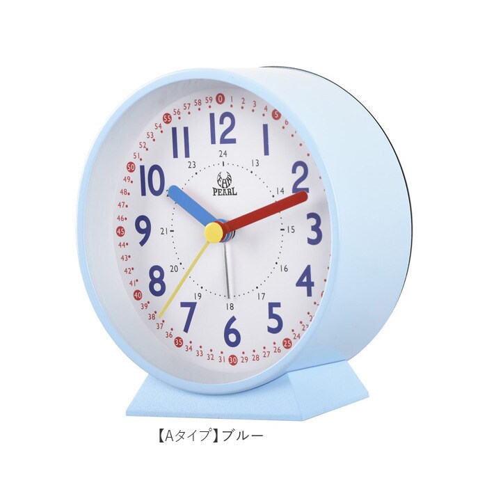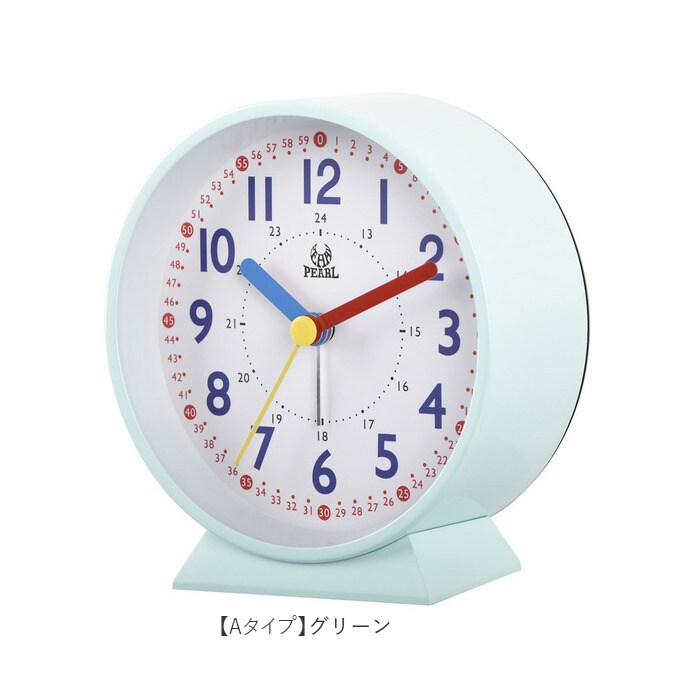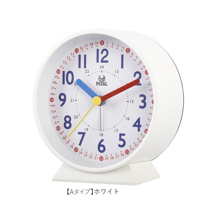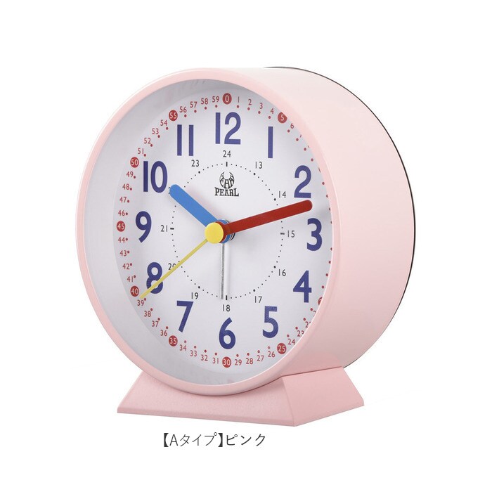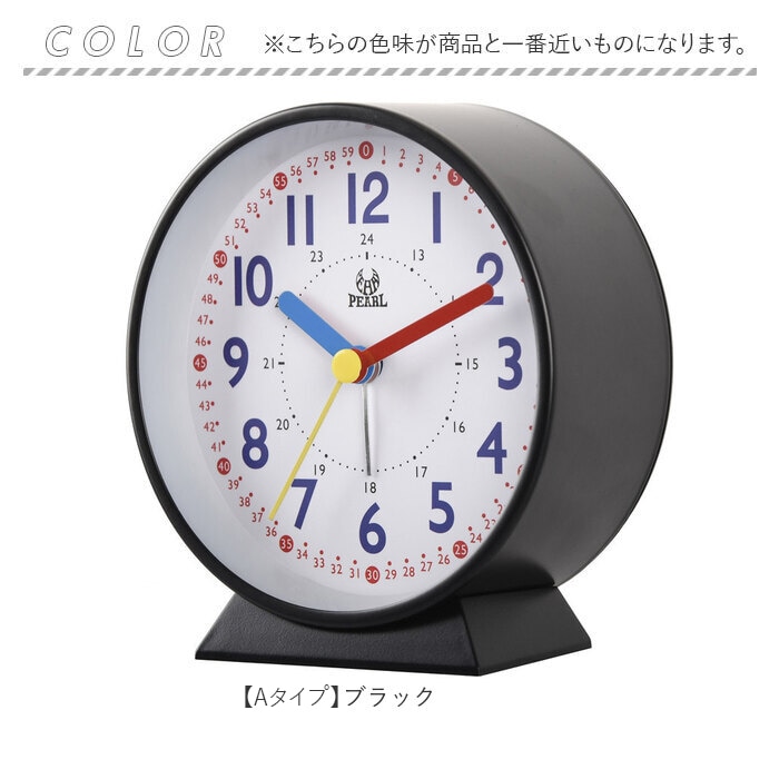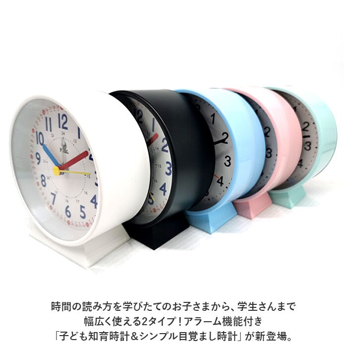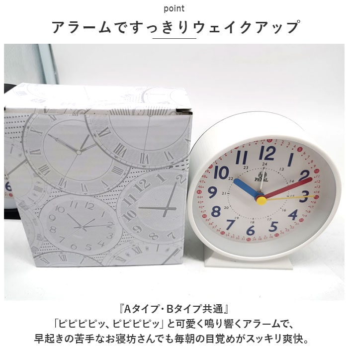 | 商品説明 | 時間の読み方を学びたてのお子さまから、学生さんまで幅広く使える2タイプ!アラーム機能付き「子ども知育時計&シンプル目覚まし時計」が新登場。『子ども知育目覚まし時計(Aタイプ)』【時間が見やすいカラフル仕様】コロンとまぁるい文字盤の中に、インデックス数字や60秒スケールをはっきり見やすい文字でカラフルに並べた、時間の感覚を直観的に学習できるアラームクロック。【お子さまの時間学習をサポート】文字盤外側の目盛り部分には、小さな文字で分数・60秒スケール配置。さらに、青色のインデックス数字の内側に24時間スケールを表示することで、小さなお子様から小学校高学年まで、お子さまの成長に合わせた時間学習をサポート!【時計の針も見やすく色分け】赤色の長針と水色の短針はパッと目に飛び込んでくる太めのフォルム。秒針は視認性の高い黄色で色合けし、スムーズに時間が読み取れるカラーリング。『シンプル目覚まし時計(Bタイプ)』【コロンと可愛いラウンド型】まぁるく均整のとれたラウンド型のボディに、オーソドックスなアナログ文字盤が目に優しいシンプルなアラームクロック。【パッと見やすいアナログ文字盤】真っ白な文字盤に、時刻表示の数字フォントや時計の針はシックなブラックで統一。主張しすぎない文字盤デザインが静かに流れるおうち時間にフィット。『Aタイプ・Bタイプ共通』【アラームですっきりウェイクアップ】・「ピピピピッ、ピピピピッ」と可愛く鳴り響くアラームで、早起きの苦手なお寝坊さんでも毎朝の目覚めがスッキリ爽快。【おやすみ時間を妨げない連続秒針】就寝中や読書中など、快適なリラックスタイムを妨げない「静音ムーブメント」を採用。秒針の音が気になって眠れなくなってしまうナイーブな方でも安心。【バックライト機能付き】背面の白いボタンを押すと、文字盤にほのかに灯りがともるバックライト機能付きなので、照明を暗くした寝室でも時間の確認がスムーズ。 |