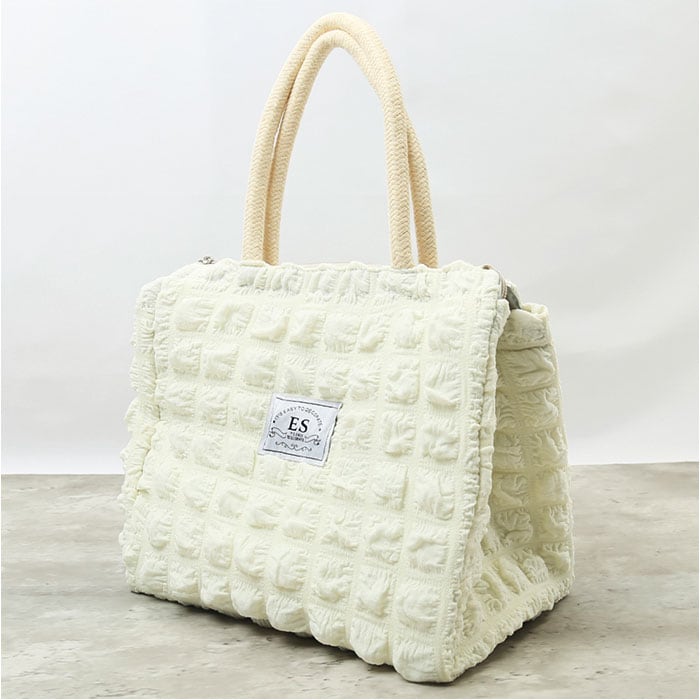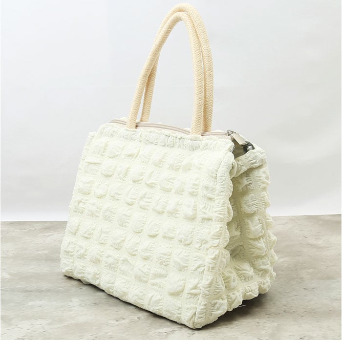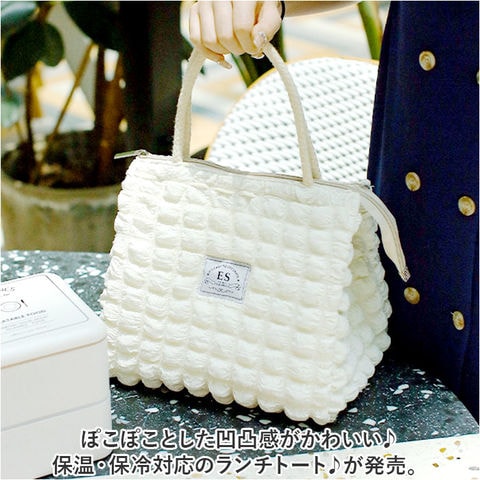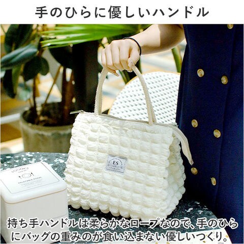 | 商品説明 | ぽこぽことした凹凸感がかわいい♪保温・保冷対応のランチトート♪が発売。【可愛らしい小ぶりサイズ】コンパクトなスクエア型フォルムとたっぷりのマチ幅で、ランチボックスは平置きに、500mlペットボトルは横に倒さずにすっぽりと収納できるサイズ感。【内側アルミシート加工】バッグの生地内側は、保温・保冷性に優れたアルミ蒸着シート仕上げ。保冷剤や凍らせたペットボトルを一緒に入れておけば、お弁当の時間まで美味しさ長持ち。【安心の天ファスナータイプ】バッグの開口部は保冷剤の冷気を逃がさないファスナータイプ。【使い方は自分次第】ランチバッグとしてはもちろん、スーパーで買った生鮮食品やデザートを持ち帰るときや、アウトドアへの食材の持ち運びにも大活躍。【手のひらに優しいハンドル】持ち手ハンドルは柔らかなロープなので、手のひらにバッグの重みのが食い込まない優しいつくり。【シーンに合わせて選べるカラー】通勤通学時のスタイルにもすっきりと馴染むカラーのバリエーション。 |