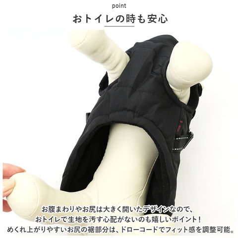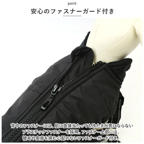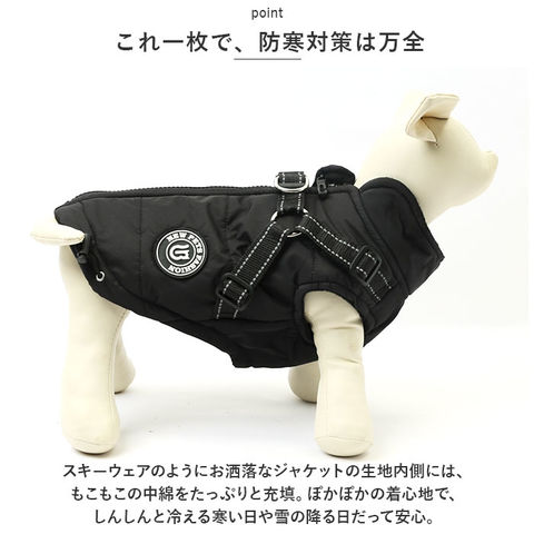 | 商品説明 | ジャケットを羽織ったら、すぐにお散歩にGO!寒い日だって元気にお散歩したいワンちゃんにオススメ「ペット用防寒ジャケット(ハーネス付き)」が新登場。【これ一枚で、防寒対策は万全】スキーウェアのようにお洒落なジャケットの生地内側には、もこもこの中綿をたっぷりと充填。ぽかぽかの着心地で、しんしんと冷える寒い日や雪の降る日だって安心。【起毛素材で暖かさをキープ】ジャケットの内側は肌触りのよい起毛加工を施したフリース素材で仕上げてあるので、身体の周りの暖かな空気をしっかりとキープ。【お出掛け前に簡単お着替え!】広げたジャケットの丸く輪になった部分に両前脚を通してから、生地をグッと身体に近づけるように持ち上げ、背中のファスナー・バックルの順に閉めるだけで装着が簡単!【ハーネス一体型デザイン】ジャケットを着たらすぐに飼い主さんとお出掛け!首輪やハーネスを別に装着する必要のない「ハーネス一体型デザイン」。背中のバックルをパチンと留めて、Dカンにリードを接続したらすぐにお散歩にGO!【安心のファスナーガード付き】背中のファスナーには、肌に直接当たっても冷たさが気にならないプラスチックファスナーを採用。ファスナー上部には、被毛や皮膚を挟む心配のないファスナーガード付き。【おトイレの時も安心】お腹まわりやお尻は大きく開いたデザインなので、おトイレで生地を汚す心配がないのも嬉しいポイント!めくれ上がりやすいお尻の裾部分は、ドローコードでフィット感を調整可能。【キラリと光るリフレクター】ハーネスのベルトには、自動車のライトをキラリと反射するリフレクター素材のステッチが縫い込まれているので、薄暗い雨の日や夜のお散歩も安心。【オシャレなお散歩コーデに】冬の散歩道に素敵に映える、色鮮やかで豊富なカラーバリエーションも魅力のひとつ。背中の「NEW PETS FASHION」のラバーネームが印象的なワンポイント。 |