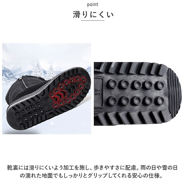 | 商品説明 | 裏起毛で足先まであったか♪タウンシーンでも活躍するスノーブーツが登場。【冬場に活躍】軽量かつワントーンカラーで仕上げたシンプルデザインだから冬場のアウトドアだけでなく、寒い冬のタウンシーンでも活躍するアイテム。【あったか裏起毛】足をふんわり包み込む、裏起毛仕様。寒い季節も足先までぬくぬくあたたかい♪履いた時のヒヤっと感が少ないのも嬉しいポイント。【履きやすい】大きく開くサイドジッパー式で脱ぎ履きがラクに出来るのが嬉しい。【滑りにくい】靴裏には滑りにくいよう加工を施し、歩きやすさに配慮。雨の日や雪の日の濡れた地面でもしっかりとグリップしてくれる安心の仕様。【フィット感を調節】履き口部分はフィット感を調節できるコードロック付き【付属のインソール】付属のインソールは暖かいボア仕様でさらに暖かく。取り外していつでも気軽に洗えるのが嬉しいポイント。 |