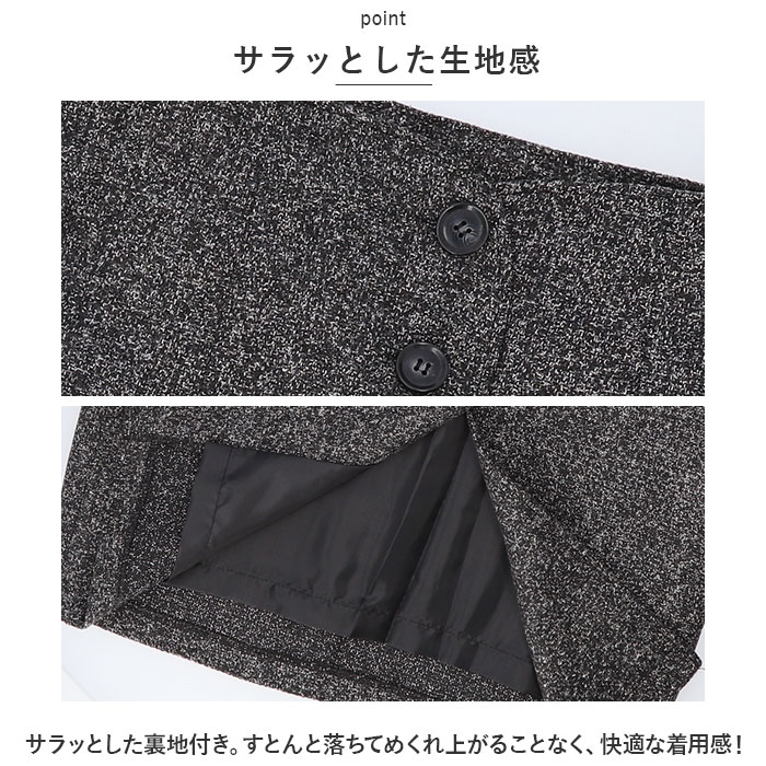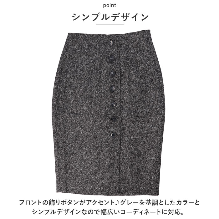 | 商品説明 | 大人上品なタイトスカートが新発売♪【タイトなシルエット】広がりを抑えた膝丈のタイトスカート。綺麗に女性らしいシルエットを演出♪【シンプルデザイン】フロントの飾りボタンがアクセント♪グレーを基調としたカラーとシンプルデザインなので幅広いコーディネートに対応。【ロングシーズン対応】お手持ちのストッキングやタイツなどと合わせれば、秋から春先まで使えるアイテム。【サラッとした生地感】サラッとした裏地付き。すとんと落ちてめくれ上がることなく、快適な着用感! |