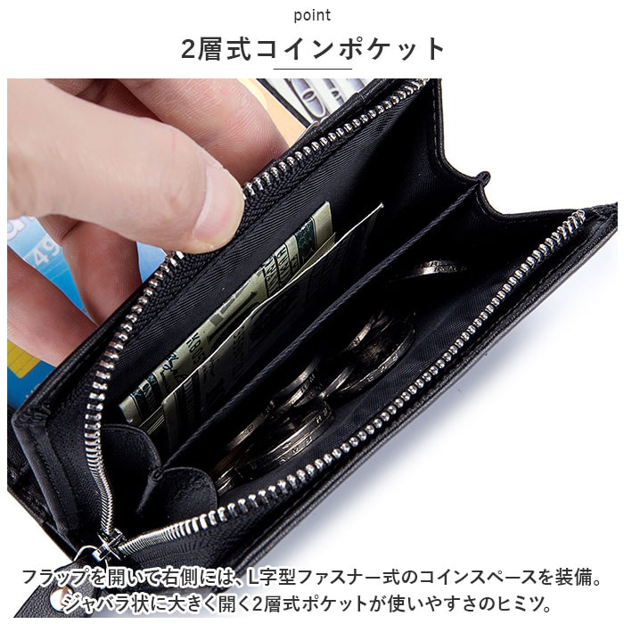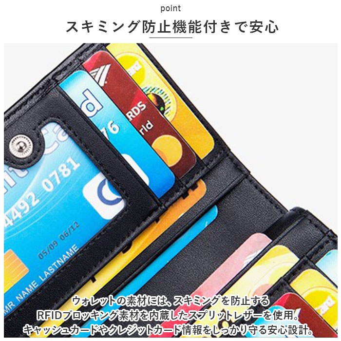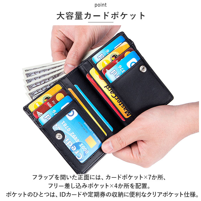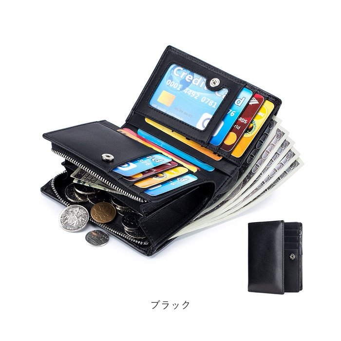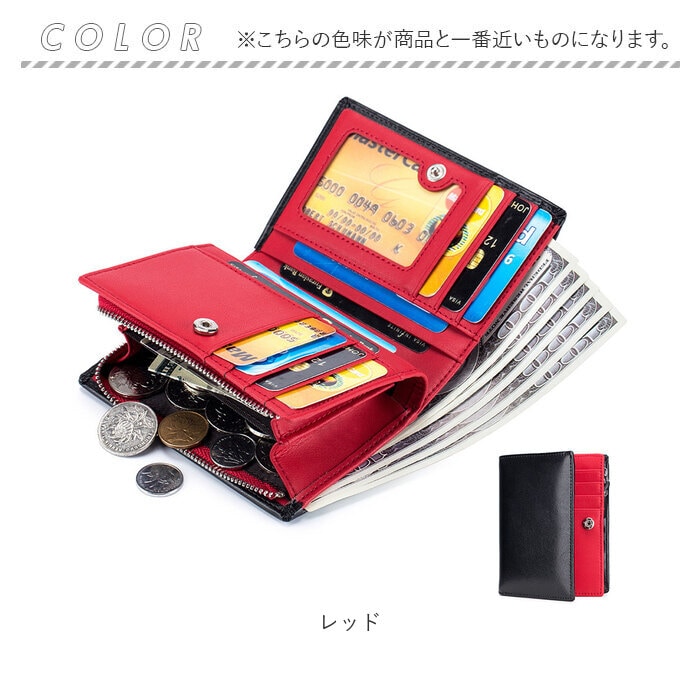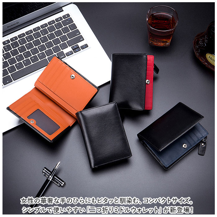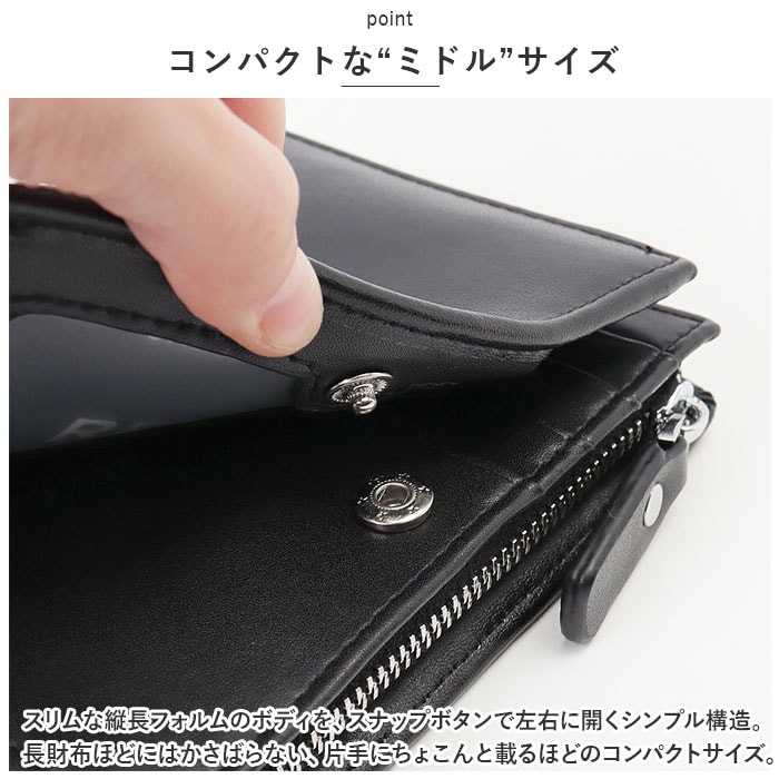 | 商品説明 | 女性の華奢な手のひらにもピタッと馴染む、コンパクトサイズ。シンプルで使いやすい「二つ折りミドルウォレット」が新登場!【コンパクトな“ミドル”サイズ】スリムな縦長フォルムのボディを、スナップボタンで左右に開くシンプル構造。長財布ほどにはかさばらない、片手にちょこんと載るほどのコンパクトサイズ。【大容量カードポケット】フラップを開いた正面には、カードポケット×7か所、フリー差し込みポケット×4か所を配置。ポケットのひとつは、IDカードや定期券の収納に便利なクリアポケット仕様。【スキミング防止機能付きで安心】ウォレットの素材には、スキミングを防止するRFIDブロッキング素材を内蔵したスプリットレザーを使用。キャッシュカードやクレジットカード情報をしっかり守る安心設計。【2つに仕切られたお札入れ】札入れスペースは2つのポケットに仕切られているので、紙幣を額面ごとに分けたり、レシートの整理がしやすい造り。【2層式コインポケット】フラップを開いて右側には、L字型ファスナー式のコインスペースを装備。ジャバラ状に大きく開く2層式ポケットが使いやすさのヒミツ。【ユニセックスデザイン】ウォレットの表生地はクールで落ち着いたブラック、内側の生地はビビッドカラーで仕上げたバイカラーデザイン。ワイルドな男性のファッションにはもちろん、マニッシュに決めたい女性にもフィットするユニセックス仕様。【ポケット仕様】[札入れスペース]札入れポケット×2[フラップ内側]カードポケット×7、フリー差し込みポケット×4[コインスペース]コインポケット×2 |