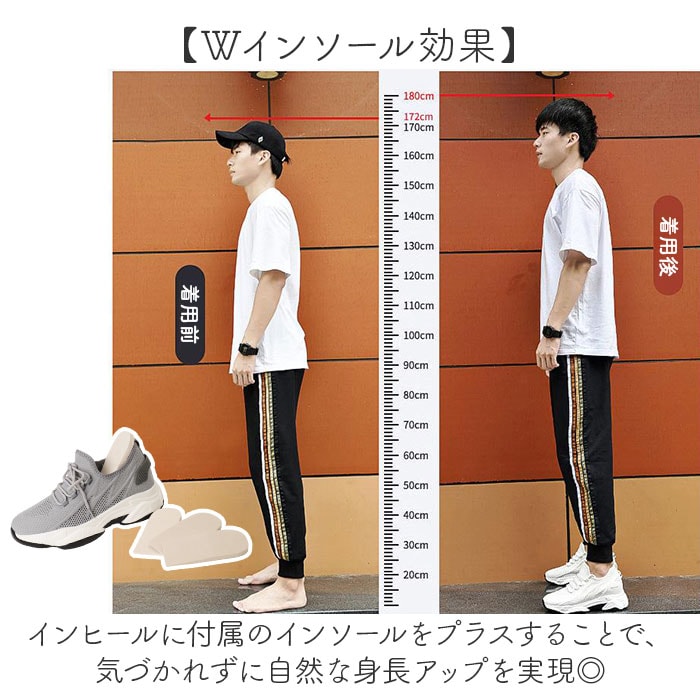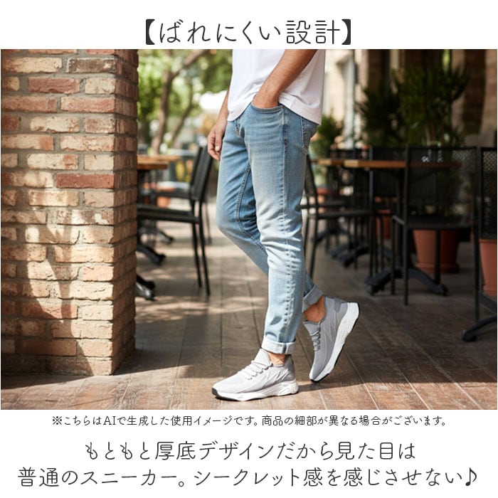 | 商品説明 | 【自然に身長アップ】インヒールとインソールのW効果で、自然にスタイルアップが叶うスニーカー。【Wインソール効果】インヒールに付属のインソールをプラスすることで、気づかれずに自然な身長アップを実現する優秀アイテム◎【ばれにくい設計】もともと厚底デザインだから見た目は普通のスニーカー、シークレット感を感じさせない自然な仕上がり♪【男女兼用デザイン】シンプルでカジュアルなスタイルだから、男女問わず幅広いコーディネートに合わせやすく豊富なサイズ対応。【メッシュで快適】通気性の良いメッシュ素材を採用し、長時間履いても蒸れにくく快適な履き心地をキープしてくれる機能性〇 |