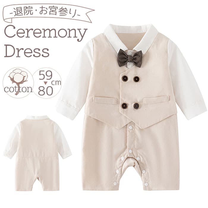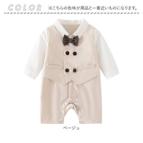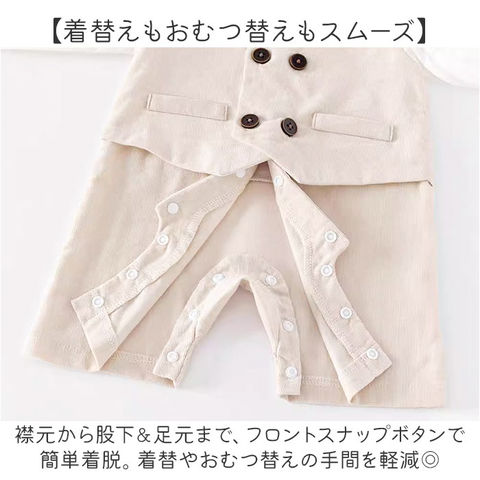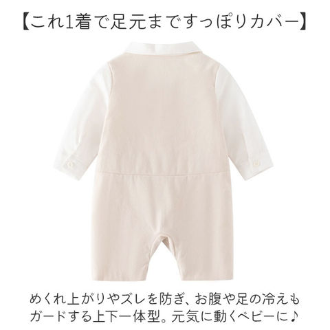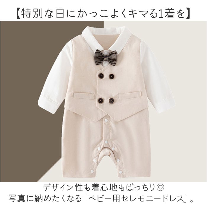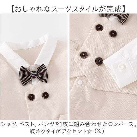 | 商品説明 | 【特別な日にかっこよくキマる1着を】デザイン性も着心地もばっちり◎写真に納めたくなる「ベビー用セレモニードレス」。【おしゃれなスーツスタイルが完成】シャツ、ベスト、パンツを1枚に組み合わせたロンパース。蝶ネクタイがアクセント☆(※)蝶ネクタイは縫いつけられており、ベストのポケットはフェイクです。【これ1着で足元まですっぽりカバー】めくれ上がりやズレを防ぎ、お腹や足の冷えもガードする上下一体型。元気に動くベビーに♪【デリケート肌にも優しいコットン製】チクチク感がなく、柔らかな肌触り。ベビーの素肌に触れても負担がかからず安心。【着替えもおむつ替えもスムーズ】襟元から股下&足元まで、フロントスナップボタンで簡単着脱。着替やおむつ替えの手間を軽減◎【フォーマルシーンやイベントで活躍】お宮参りやお呼ばれシーン、月齢フォトに♪ナチュラルな色合いも魅力。 |