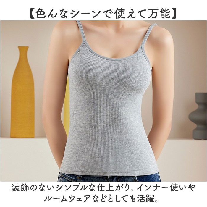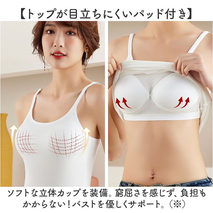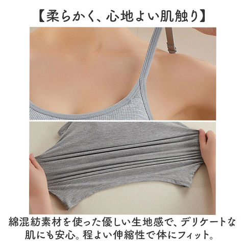 | 商品説明 | 【ストレスなく着こなせるアイテム】締め付けがなくリラックス♪ブラとキャミソールが一体になった「ブラトップ」。【トップが目立ちにくいパッド付き】ソフトな立体カップを装備。窮屈さを感じず、負担もかからない!バストを優しくサポート。(※)縫い付けられているため、取り外しはできません。ストラップは長さ調節可能です。【柔らかく、心地よい肌触り】綿混紡素材を使った優しい生地感で、デリケートな肌にも安心。程よい伸縮性で体にフィット。【デコルテもすっきりキレイ魅せ】深めに開いたネックライン。女性らしさが際立ち、ネックレスも映える♪【色んなシーンで使えて万能】装飾のないシンプルな仕上がり。インナー使いやルームウェアなどとしても活躍。 |