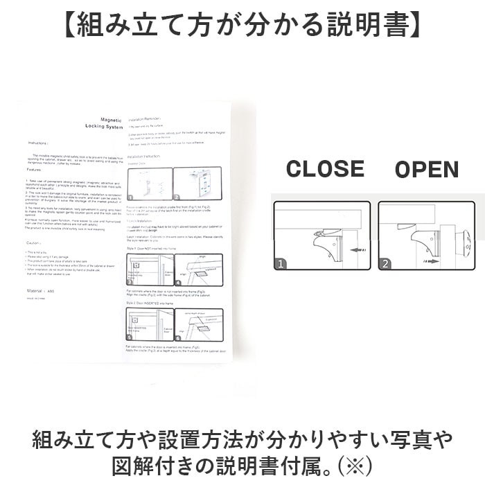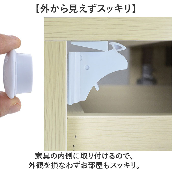 | 商品説明 | 【お子様のイタズラ対策に】小さなお子様のイタズラやけがの対策に役立つ☆マグネットタイプのチャイルドロック。【内側からロックで安心】引き出しを閉めるとフックで自動的にロック!内側からの施錠で外側から開けられらない♪【専用のキーで簡単開錠】マグネットキーをフック部分に近づけるだけで開く♪手間ナシで簡単開錠できるのもポイント。【ペタッと貼るだけでOK】ママさんも設置しやすい工具がいらない粘着シールタイプ。【外から見えずスッキリ】家具の内側に取り付けるので、外観を損なわずお部屋もスッキリ。【取り付け場所いろいろ】キッチン・TV台・食器棚など多用途に使える万能アイテム。【組み立て方が分かる説明書】組み立て方や設置方法が分かりやすい写真や図解付きの説明書付属。※(※)テキストは英語で書かれています。 |