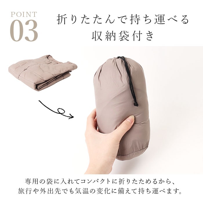 | 商品説明 | 【防寒力抜群】軽やかで暖かい、持ち運べる防寒の新定番。【2WAYで着こなし自在】ボタンの留め方次第でラウンドネックとVネックにスタイルチェンジ♪【軽さと暖かさの両立】軽量な薄手生地ながらダウン入りで保温性に優れ、寒い日も快適に過ごせる◎【収納袋付きで持ち運び楽々】専用の袋に入れてコンパクトに折りたためるから、旅行や外出先でも便利〇【実用的なポケット付き】フロント両サイドのポケットでスマホや小物の収納はもちろん手を温めるのにも重宝!【無地でスタイリング万能】シンプルなデザインだからカジュアルからきれいめまで幅広いコーデに馴染む。 |