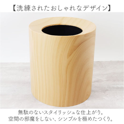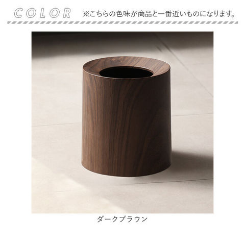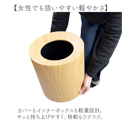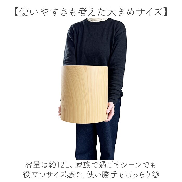 | 商品説明 | 【インテリアとしても使える大人顔】ゴミ袋を見せず、すっきりとした佇まい。ツヤを抑えた、マットな木目調のゴミ箱。【洗練されたおしゃれなデザイン】無駄のないスタイリッシュな仕上がり。空間の邪魔をしない、シンプルを極めたつくり。【生活感をなくしたい方におすすめ】インナーダストボックスにゴミ袋をセット。カバーを被せれば、袋が見えない構造◎【ポイッと捨てやすく中身も見せない】口部分は内側にかけて傾斜を付けることで、ゴミを捨てやすい◎中が見えにくいのもポイント。(※1)ゴミ袋が1巻付属しております。【お手入れも簡単で清潔をキープ】ゴミ袋を使えば、本体が直接汚れる心配なし!汚れが気になてもサッと拭き取るだけでOK。(※2)汚れがひどい時は丸洗いも可能ですが、水気をすぐに拭き取ってください。【落ち着きのあるナチュラルな風合い】優しい印象の円形シルエット。美しい木目を表現した、インテリア性の高いデザインが魅力。【使いやすさも考えた大きめサイズ】容量は約12L。家族で過ごすシーンでも役立つサイズ感で、使い勝手もばっちり◎【女性でも扱いやすい軽やかさ】カバーもインナーボックスも軽量設計。サッと持ち上げやすく、移動もラクラク。 |