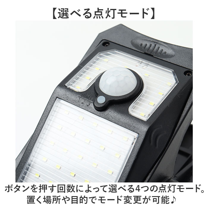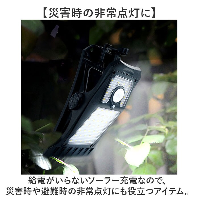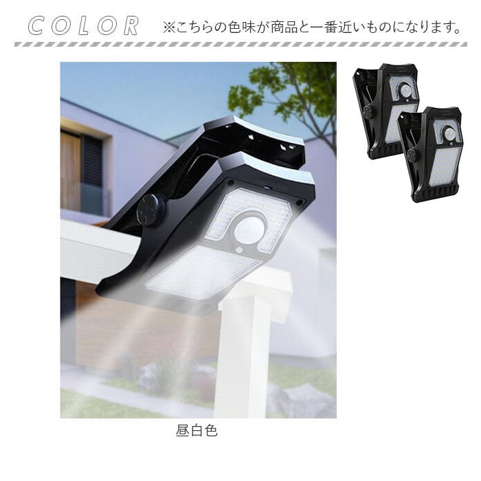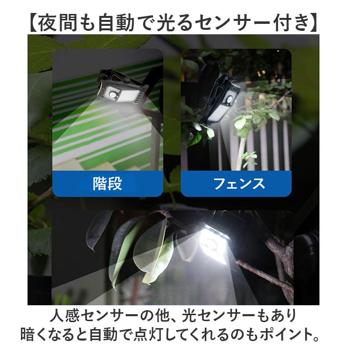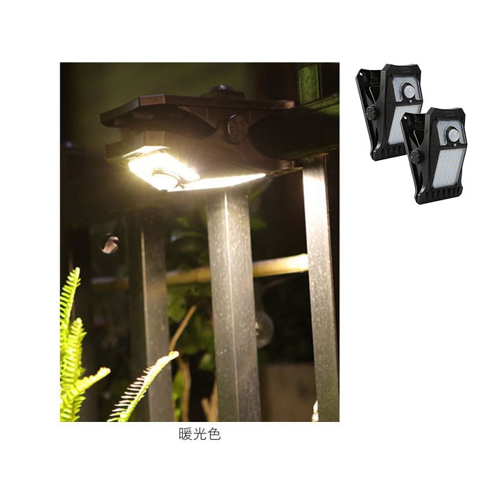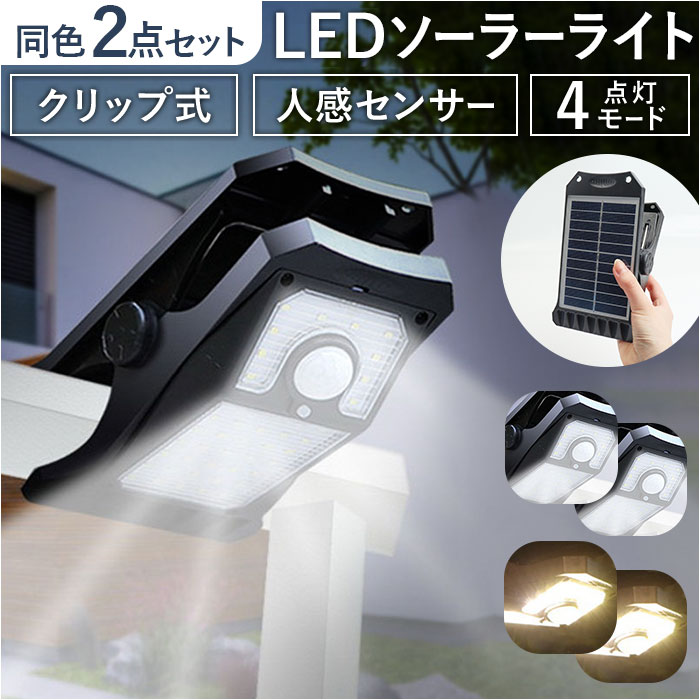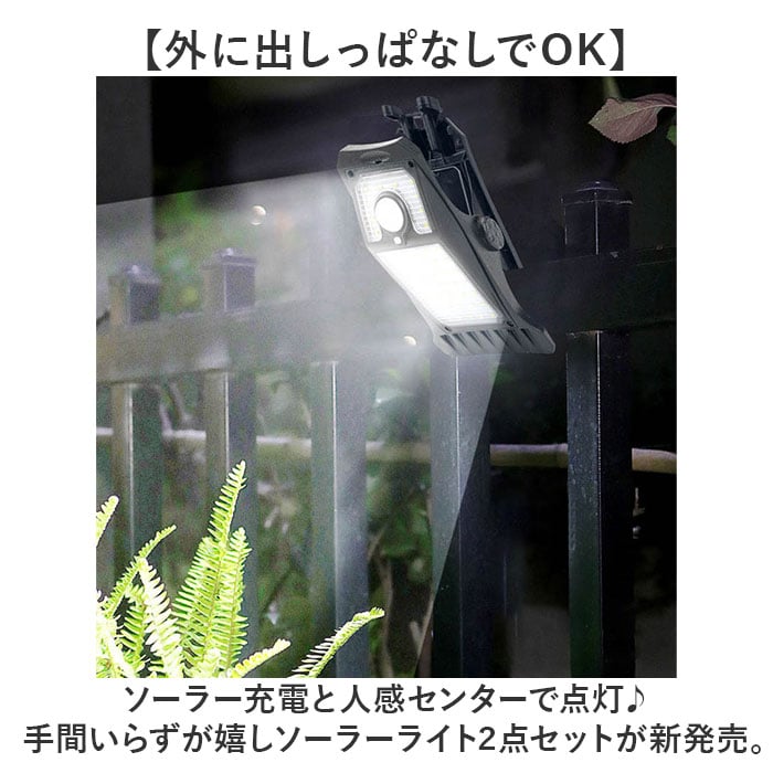 商品説明【外に出しっぱなしでOK】ソーラー充電と人感センサーで点灯♪手間いらずが嬉しソーラーライト2点セットが新発売。【ソーラー充電式】ソーラー充電式なので、設置するだけで長く使える!電気代0円、電池交換の手間いらず◎【取り付け簡単なクリップ式】塀やフェンス等に挟んで使えるクリップ式。壁面に設置できるフックも付属!【雨天時も安心のIP44】雨の日や風が強い日も安心なIP44構造で、外に出しっぱなしでも壊れにくい。【夜間も自動で光るセンサー付き】人感センサーの他、光センサーもあり暗くなると自動で点灯してくれるのもポイント。【選べる点灯モード】ボタンを押す回数によって選べる4つの点灯モード。置く場所や目的でモード変更が可能♪【LEDでしっかり光る】電灯はLEDを採用。ピカッと周りへをしっかり照らしてくれるので防犯対策にも!【災害時の非常点灯に】給電がいらないソーラー充電なので、災害時や避難時の非常点灯にも役立つアイテム。
