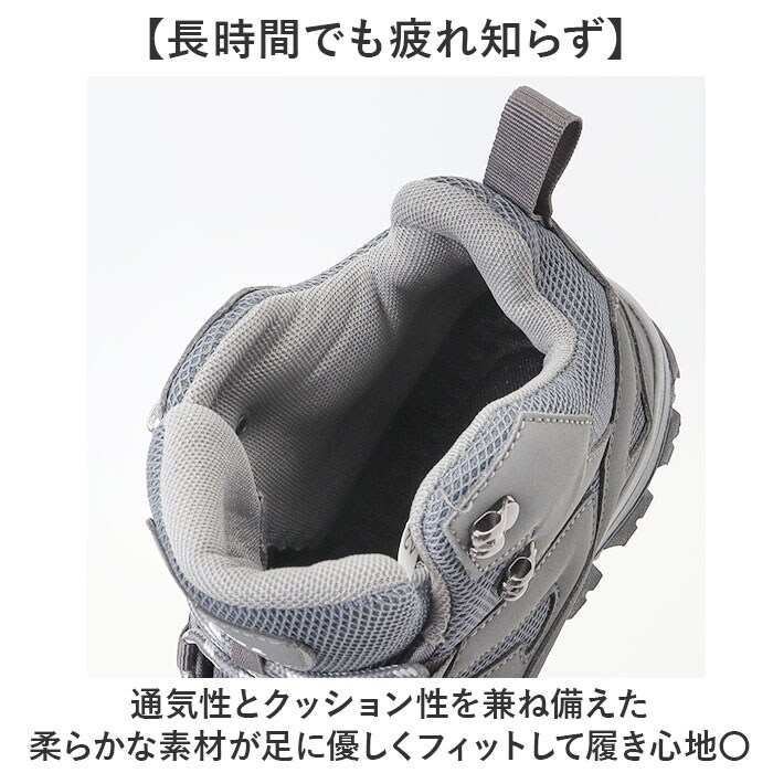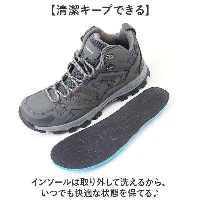 | 商品説明 | 【山も街も快適に歩ける】本格アウトドアから日常使いまで頼れる一足。【足首ホールドで安定感】ハイカットデザインが足首までしっかり支え、不安定な山道も安心して歩ける◎【滑りにくい凹凸ソール】アウトソールの深い凹凸が地面をしっかりグリップし、濡れた地面や不安定な足場でも安全に踏み出せる!【長時間でも疲れ知らず】通気性とクッション性を兼ね備えた柔らかな素材が足に優しくフィットして履き心地〇【タフな作りで長持ち】耐久性に優れた素材を使用し、ハードなトレッキングシーンでも長く愛用できる。【清潔キープできる】インソールは取り外して洗えるから、いつでも快適な状態を保てる♪ |
