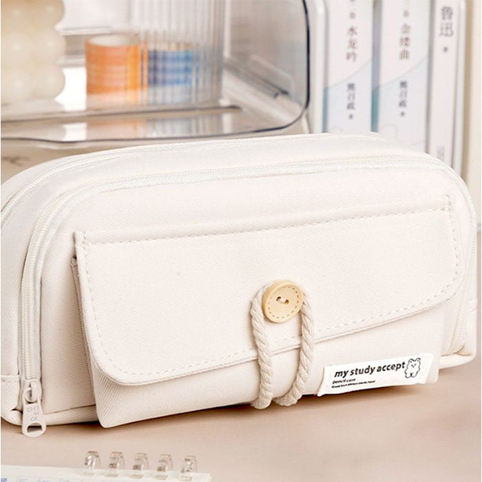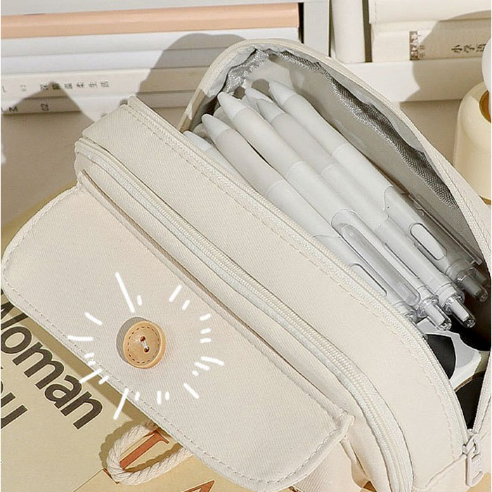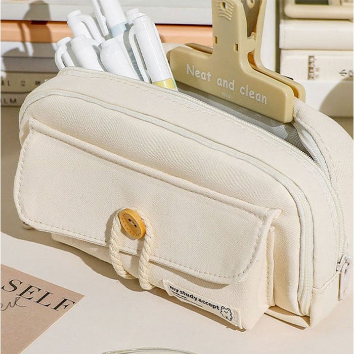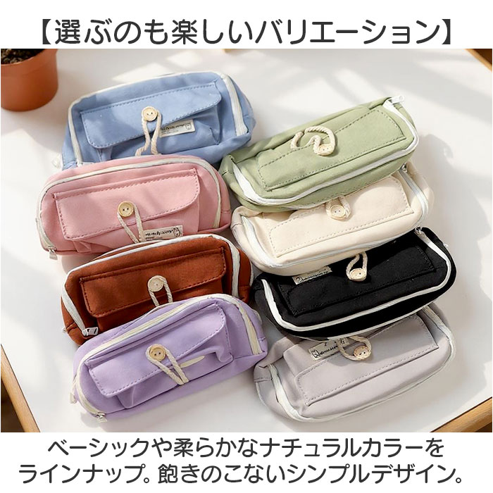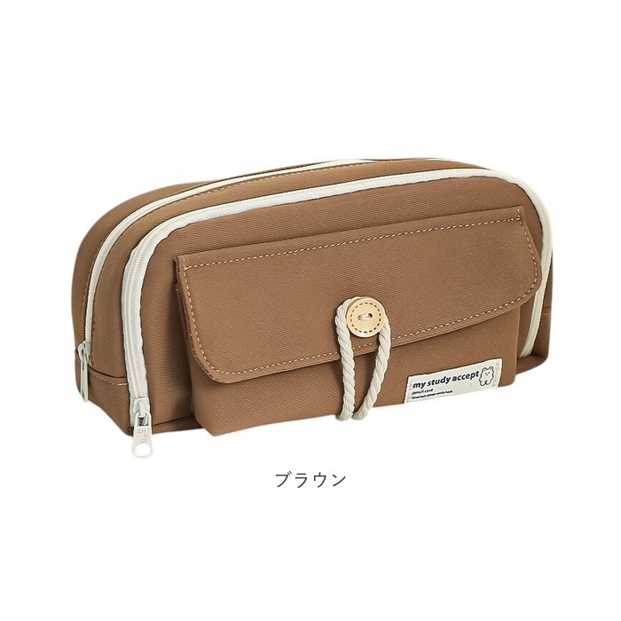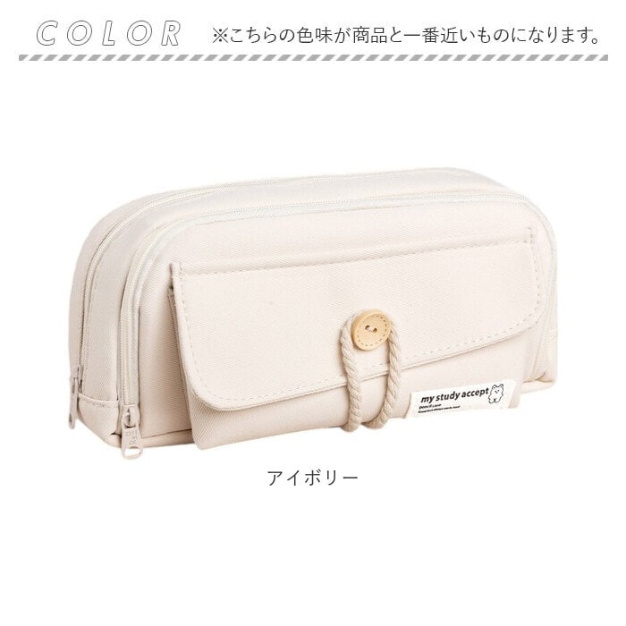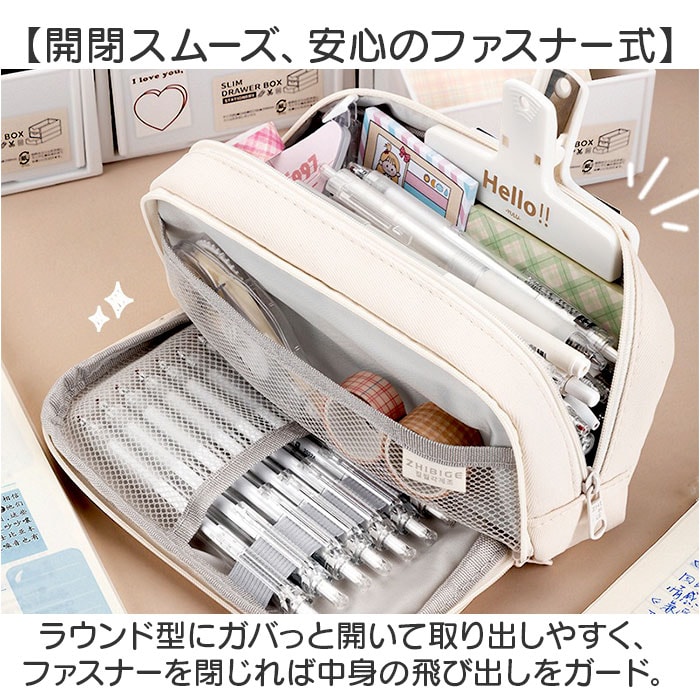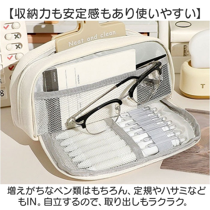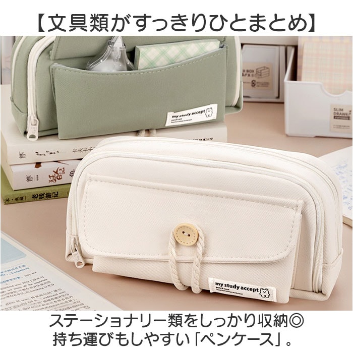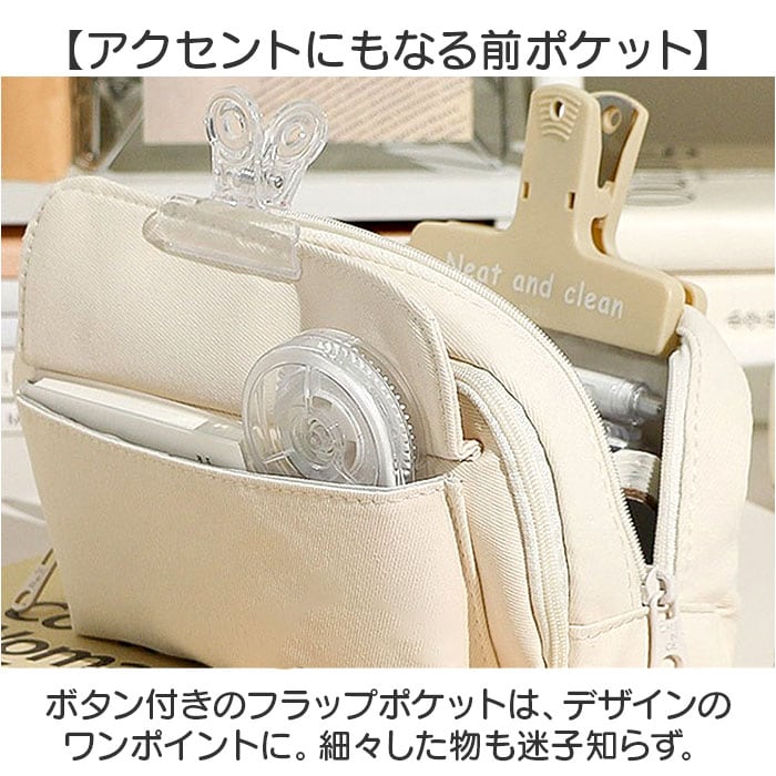 | 商品説明 | 【文具類がすっきりひとまとめ】ステーショナリー類をしっかり収納◎持ち運びもしやすい「ペンケース」。【開閉スムーズ、安心のファスナー式】ラウンド型にガバっと開いて取り出しやすく、ファスナーを閉じれば中身の飛び出しをガード。【収納力も安定感もあり使いやすい】増えがちなペン類はもちろん、定規やハサミなどもIN。自立するので、取り出しもラクラク。【サッと取り出せるサブルーム】メインと同じくラウンド型にオープン。ポケット付きで、修正テープやペンも見やすく整頓。【アクセントにもなる前ポケット】ボタン付きのフラップポケットは、デザインのワンポイントに。細々した物も迷子知らず。【選ぶのも楽しいバリエーション】ベーシックや柔らかなナチュラルカラーをラインナップ。飽きのこないシンプルデザイン。【ポケット仕様】サブルーム:メッシュポケット×1、メッシュ仕様のペンホルダー×1(ゴムベルト付き)前面:ボタン付きフラップポケット×1 |