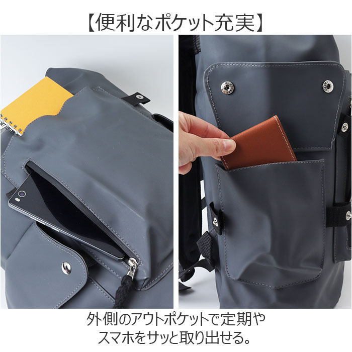 | 商品説明 | 【通勤通学に頼れる】フラップ使いがおしゃれなリュックサック♪【雨や汚れに強い】撥水加工だから突然の雨でも中身をしっかりガード◎※完全防水ではありません。【嬉しい大容量】A4サイズがすっぽり入り、クッション内蔵ポケット付きでノートPCの持ち運びも◎【便利なポケット充実】外側のアウトポケットで定期やスマホをサッと取り出せる。【ユニセックスで使える】男女関係なく持てるカジュアルデザイン。家族やカップルでお揃いにするのもおすすめ。 |