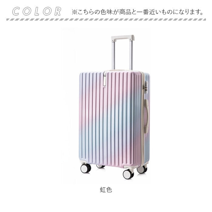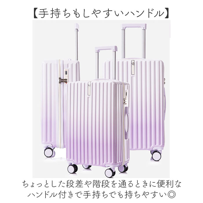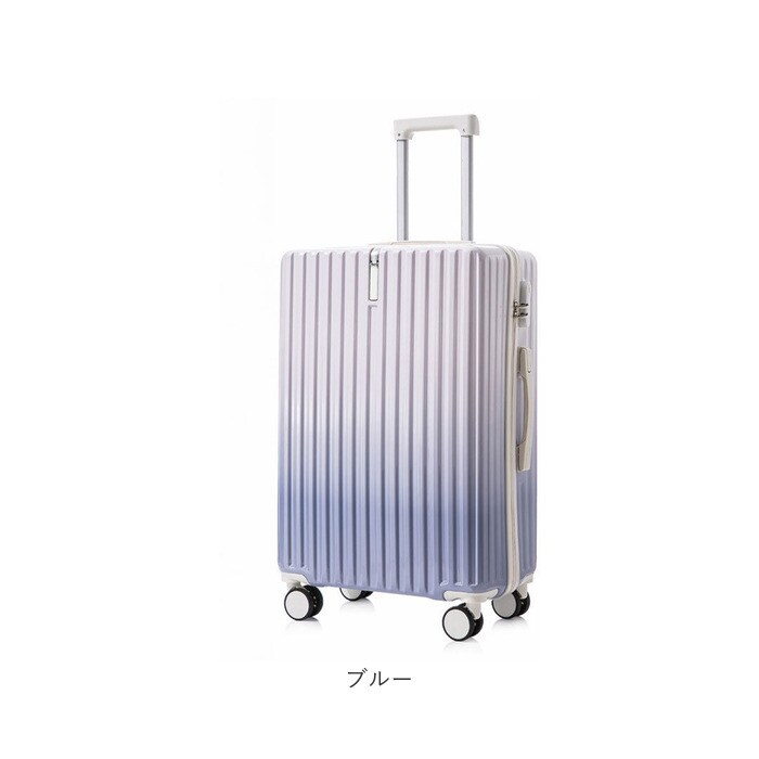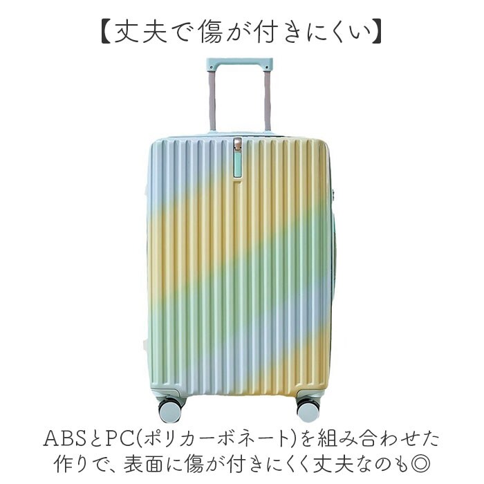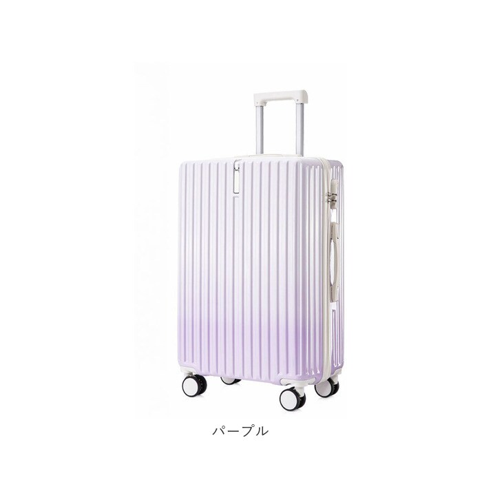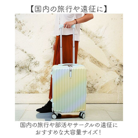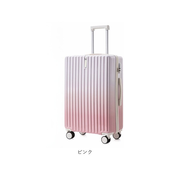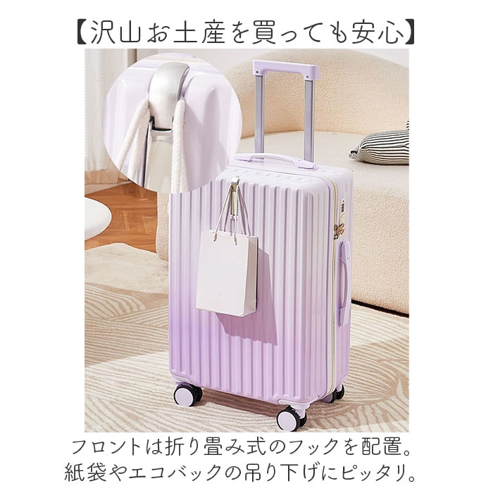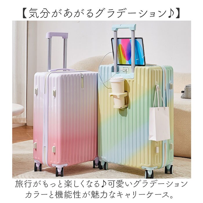| 商品説明 | 【気分があがるグラデーション♪】旅行がもっと楽しくなる♪可愛いグラデーションカラーと機能性が魅力なキャリーケース。【国内の旅行や遠征に】国内の旅行や部活やサークルの遠征におすすめな大容量サイズ!【ポーチや着替えを仕分けて収納】クロスバンドや内装のポケットを設け、仕分けて収納できごちゃつかずパッキングも楽ちん♪【置き場所に困るカップもIN】背面にはカップホルダーを搭載。移動中のカップやペットボトルの置き場所に困らない!【沢山お土産を買っても安心】フロントは折り畳み式のフックを配置。紙袋やエコバックの吊り下げにピッタリ。【安心のロック機能付き】盗難防止のロック機能付き♪ナンバーロックなので鍵の紛失の心配もなし☆※1【充電可能なUSBポート】中のコードとモバイルバッテリーを繋げれば、そのまま充電できるUSBポート機能。※2【高さ調節ができるハンドル】ハンドルは2段階調節ができ、女性から男性まで移動しやすい高さに調節可能。【手持ちもしやすいハンドル】ちょっとした段差や階段を通るときに便利なハンドル付きで手持ちでも持ちやすい◎【スムーズな走行が可能】8つの車輪と360度回転するキャスターで、左右前後どの向きの走行もスムーズに。【丈夫で傷が付きにくい】ABSとPC(ポリカーボネート)を組み合わせた作りで、表面に傷が付きにくく丈夫なのも◎【ポケット仕様】メインルーム・・・ファスナーポケット×2、クロスバンド付き収納スペース×1【注意事項】※1 TSA機能はございませんので、海外空港の荷物検査の際はご注意ください。※2 オス/typeA メス/typeA オスのケーブル以外付属のケーブルはございません。 |