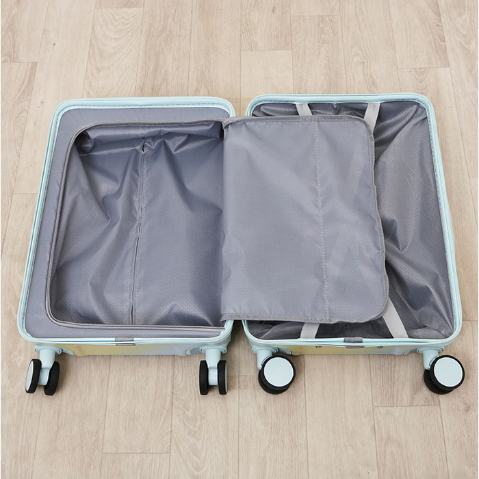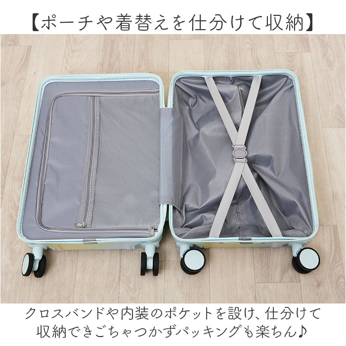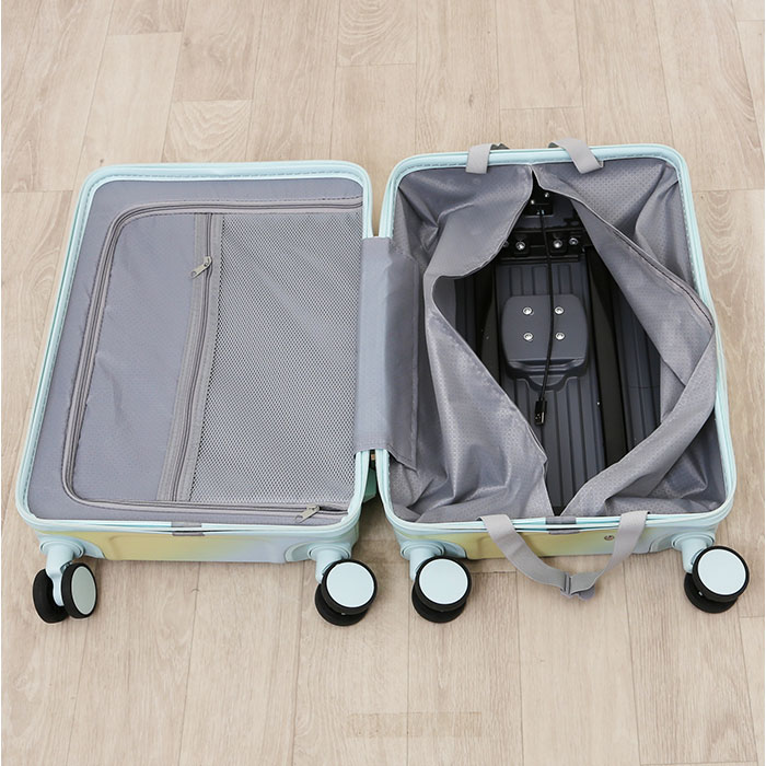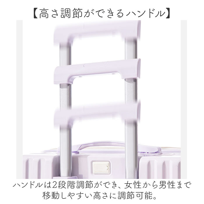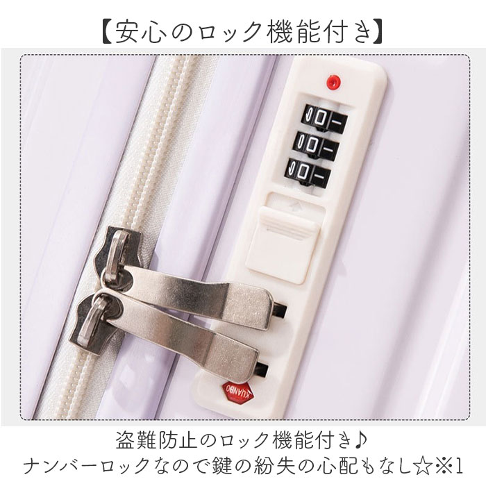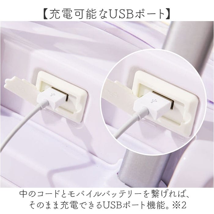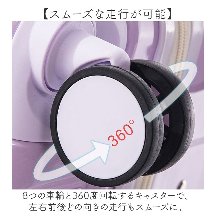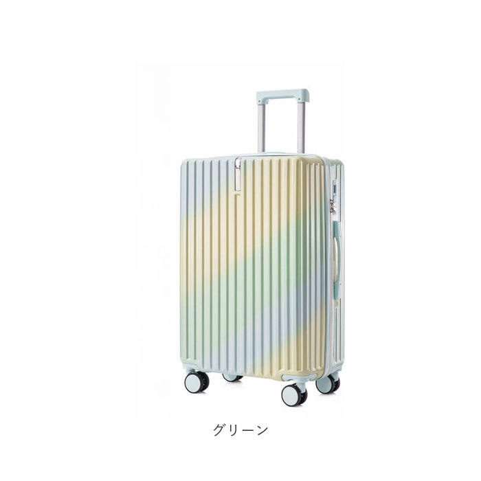 | 商品説明 | 【気分があがるグラデーション♪】旅行がもっと楽しくなる♪可愛いグラデーションカラーと機能性が魅力なキャリーケース。【国内の旅行や遠征に】国内の旅行や部活やサークルの遠征におすすめな大容量サイズ!【ポーチや着替えを仕分けて収納】クロスバンドや内装のポケットを設け、仕分けて収納できごちゃつかずパッキングも楽ちん♪【置き場所に困るカップもIN】背面にはカップホルダーを搭載。移動中のカップやペットボトルの置き場所に困らない!【沢山お土産を買っても安心】フロントは折り畳み式のフックを配置。紙袋やエコバックの吊り下げにピッタリ。【安心のロック機能付き】盗難防止のロック機能付き♪ナンバーロックなので鍵の紛失の心配もなし☆※1【充電可能なUSBポート】中のコードとモバイルバッテリーを繋げれば、そのまま充電できるUSBポート機能。※2【高さ調節ができるハンドル】ハンドルは2段階調節ができ、女性から男性まで移動しやすい高さに調節可能。【手持ちもしやすいハンドル】ちょっとした段差や階段を通るときに便利なハンドル付きで手持ちでも持ちやすい◎【スムーズな走行が可能】8つの車輪と360度回転するキャスターで、左右前後どの向きの走行もスムーズに。【丈夫で傷が付きにくい】ABSとPC(ポリカーボネート)を組み合わせた作りで、表面に傷が付きにくく丈夫なのも◎【ポケット仕様】メインルーム・・・ファスナーポケット×2、クロスバンド付き収納スペース×1【注意事項】※1 TSA機能はございませんので、海外空港の荷物検査の際はご注意ください。※2 オス/typeA メス/typeA オスのケーブル以外付属のケーブルはございません。 |