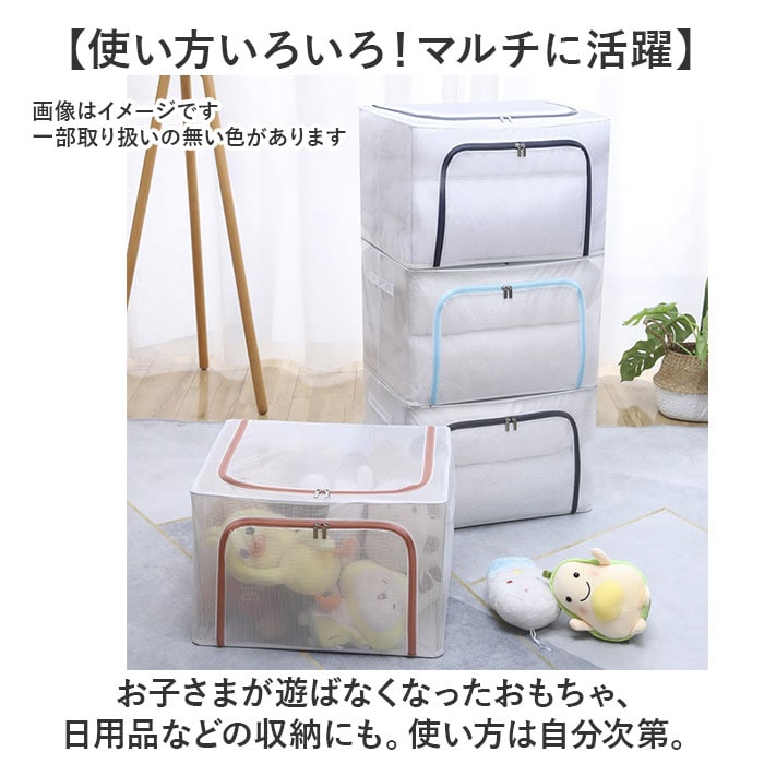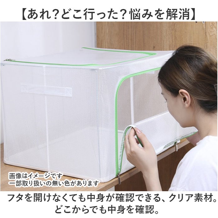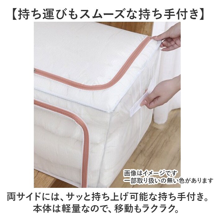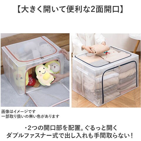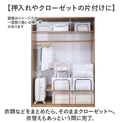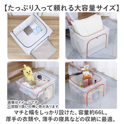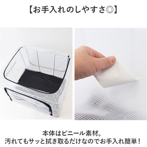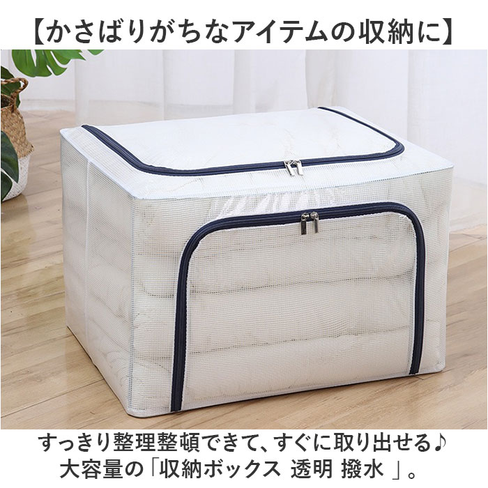 | 商品説明 | 【かさばりがちなアイテムの収納に】すっきり整理整頓できて、すぐに取り出せる♪大容量の「収納ボックス 透明 はっ水 」。【たっぷり入って頼れる大容量サイズ】マチと幅をしっかり設けた、容量約66L。厚手の衣類や、薄手の寝具などの収納に最適。【あれ?どこ行った?悩みを解消】フタを開けなくても中身が確認できる、クリア素材。どこからでも中身を確認。【大きく開いて便利な2面開口】・2つの開口部を配置。ぐるっと開くダブルファスナー式で出し入れも手間取らない!【へたりにくくスタッキングも安心】内側には折りたたみ式のフレーム。3辺を固定できて型崩れしにくく、積み重ねOK。【持ち運びもスムーズな持ち手付き】両サイドには、サッと持ち上げ可能な持ち手付き。本体は軽量なので、移動もラクラク。【お手入れのしやすさ◎】本体はビニール素材。汚れてもサッと拭き取るだけなのでお手入れ簡単!【使い方いろいろ!マルチに活躍】お子さまが遊ばなくなったおもちゃ、日用品などの収納にも。使い方は自分次第。【押入れやクローゼットの片付けに】衣類などをまとめたら、そのままクローゼットへ。衣替えもあっという間に完了。【使わない時はスリムにまとまる】嬉しい折りたたみ式ボックス。使わない時も収納場所に困らない! |
