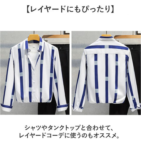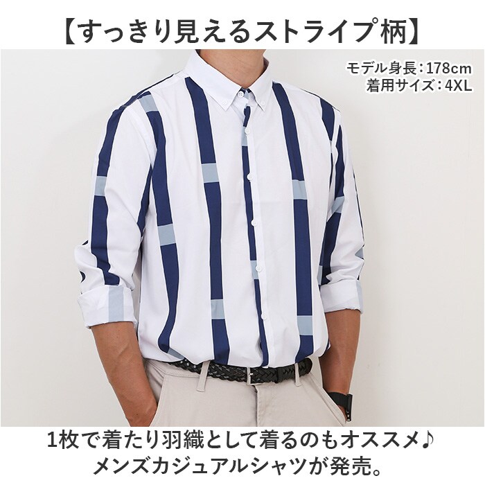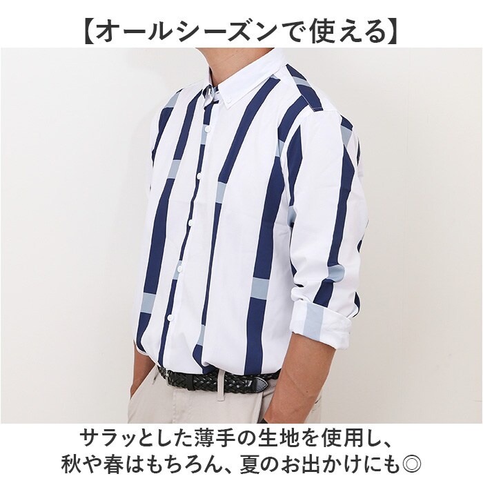 商品説明【すっきり見えるストライプ柄】・1枚で着たり羽織として着るのもオススメ♪メンズカジュアルシャツが発売。【すっきりとしたデザイン】縦に長いストライプ柄はデザイン性はもちろん、視覚効果ですっきりとした見た目。【レイヤードにもぴったり】シャツやタンクトップと合わせて、レイヤードコーデに使うのもオススメ。【きちんと感もあり】襟やカフスにボタンを配置し、カジュアルながらもきちんと感もあり◎【袖口のサイズ調整も可能】カフスボタンは2つ配置され、手首周りのフィット感の調節も可能。【オールシーズンで使える】サラッとした薄手の生地を使用し、秋や春はもちろん、夏のお出かけにも◎