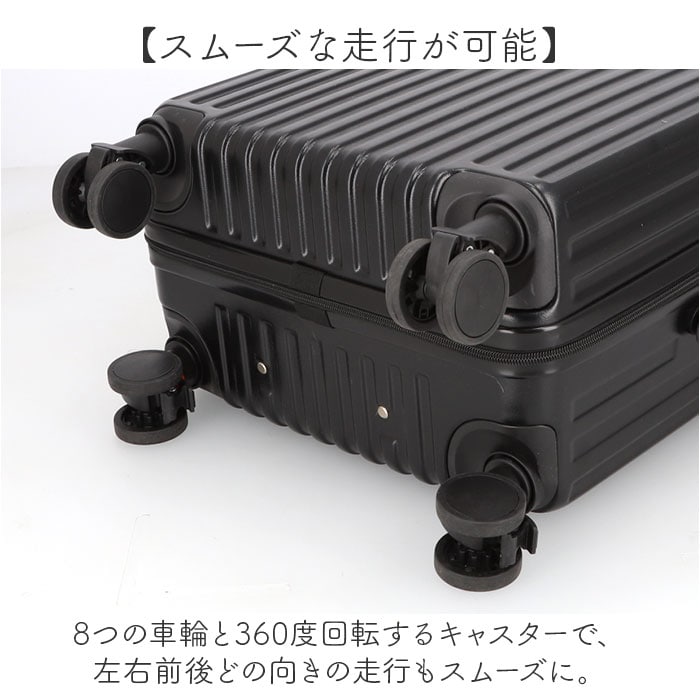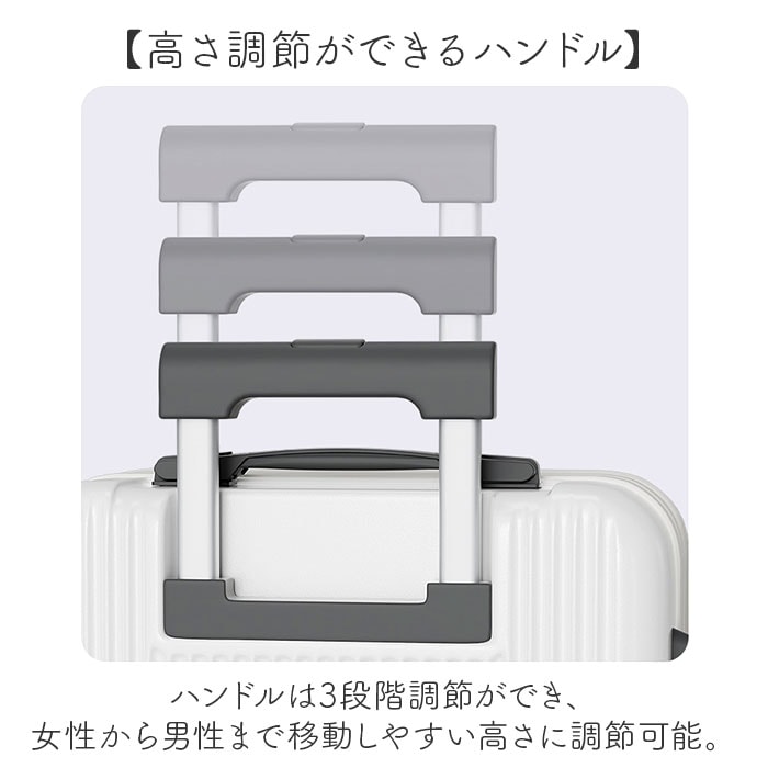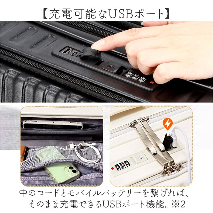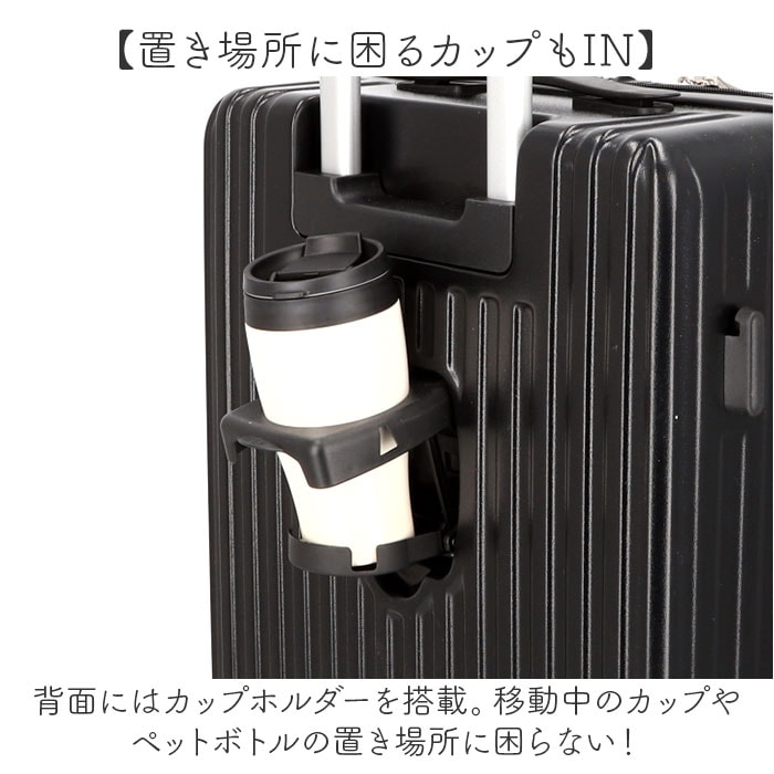 | 商品説明 | 【使いやすい工夫がたくさん】出張や旅行を快適にサポート☆使いやすい工夫を詰め込んだ大きめのキャリーケースが新発売。【国内の旅行や出張に最適】国内の旅行や出張ならおよそ3-4泊程度の荷物の収納ができる大容量収納◎【ポーチや着替えを仕分けて収納】クロスバンドや内装のポケットを設け、仕分けて収納できごちゃつかずパッキングも楽ちん♪【フロントオープンポケット】お財布やパスケース、メモ帳などすぐに取り出したい小物の定位置にオススメ♪【置き場所に困るカップもIN】背面にはカップホルダーを搭載。移動中のカップやペットボトルの置き場所に困らない!【沢山お土産を買っても安心】フックは右サイドに4つ配置。紙袋やエコバックの吊り下げにピッタリ。【安心のロック機能付き】盗難防止のロック機能付き♪ナンバーロックなので鍵の紛失の心配もなし☆※1【充電可能なUSBポート】中のコードとモバイルバッテリーを繋げれば、そのまま充電できるUSBポート機能。※2【高さ調節ができるハンドル】ハンドルは3段階調節ができ、女性から男性まで移動しやすい高さに調節可能。【手持ちもしやすいハンドル】ちょっとした段差や階段を通るときに便利なハンドル付きで手持ちでも持ちやすい◎【スムーズな走行が可能】・8つの車輪と360度回転するキャスターで、左右前後どの向きの走行もスムーズに。【丈夫で傷が付きにくい】ABSとPC(ポリカーボネート)を組み合わせた作りで、表面に傷が付きにくく丈夫なのも◎【ポケット仕様】メインルーム・・・ファスナーポケット×1、メッシュポケット×1、クロスバンド×1フロントポケット・・・ファスナーポケット×1、メッシュポケット×1【注意事項】※1 TAS機能はございませんので、海外空港の荷物検査の際はご注意ください。※2 オス/typeA メス/typeA typeCオスのケーブル以外付属のケーブルはございません。 |