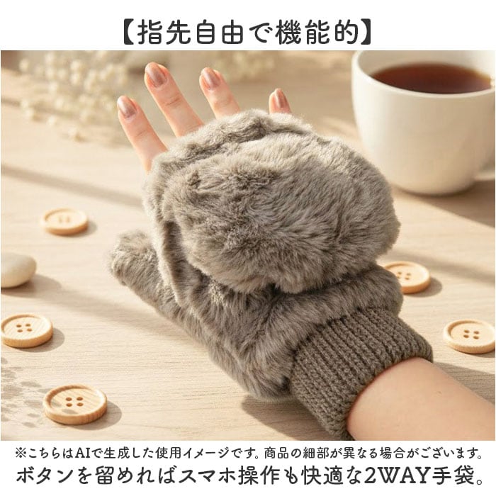 | 商品説明 | 【指先自由で機能的】ボタンを留めればスマホ操作も快適な2WAY手袋。【つけたままスマホ】指先が出せるから手袋を外さずにスマホが使える◎【2way仕様で使い分け】ミトンカバーを付ければ指先まであたたか防寒!【ふわもこ素材が可愛い】フェイクファーのふわふわ感と内側ボアで見た目も機能も◯♪【リブ仕様で冷気シャット】手首がリブデザインになっていて隙間風をしっかり防ぐ〇【紐付きで紛失対策も】取り外し可能な紐が付いているから落としにくい。 |