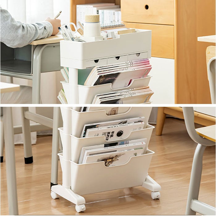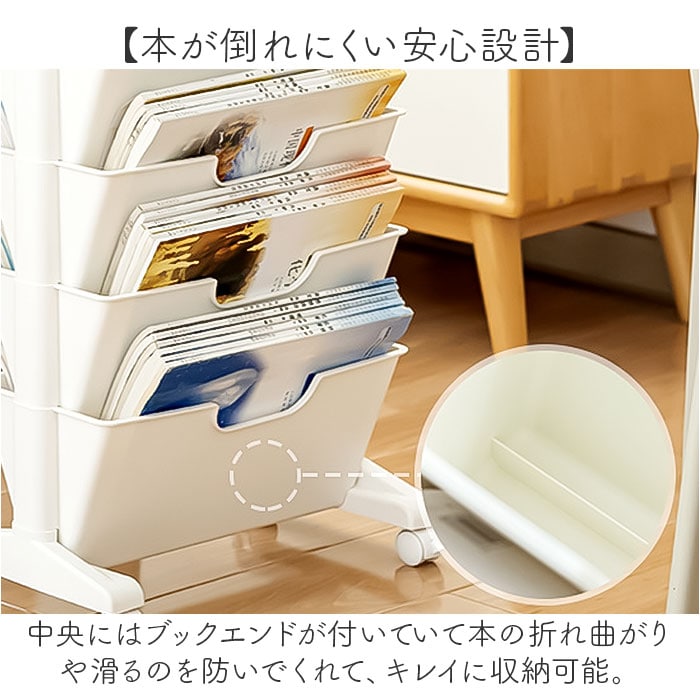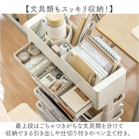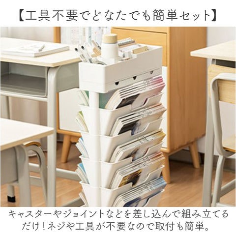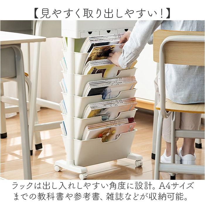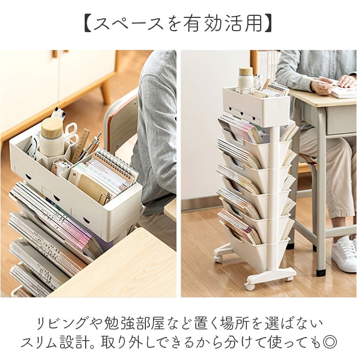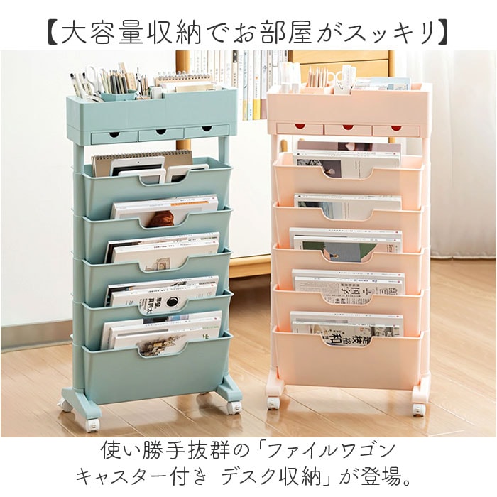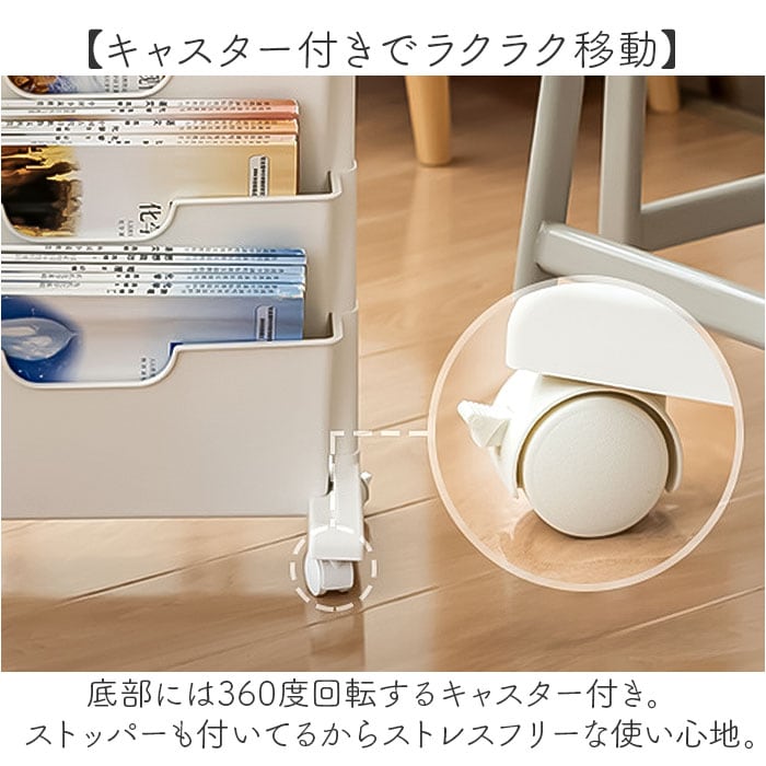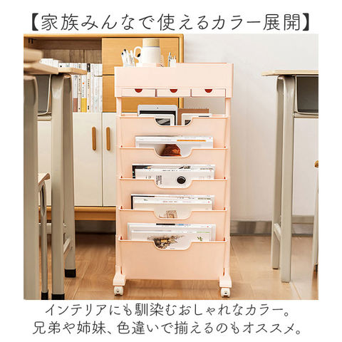 | 商品説明 | 【大容量収納でお部屋がスッキリ】使い勝手抜群の「ファイルワゴン キャスター付き デスク収納」が登場。【見やすく取り出しやすい!】ラックは出し入れしやすい角度に設計。A4サイズまでの教科書や参考書、雑誌などが収納可能。【本が倒れにくい安心設計】中央にはブックエンドが付いていて本の折れ曲がりや滑るのを防いでくれて、キレイに収納可能。【文具類もスッキリ収納!】最上段はごちゃつきがちな文具類を分けて収納できる引き出しや仕切り付きのペン立て付き。【スペースを有効活用】リビングや勉強部屋など置く場所を選ばないスリム設計。取り外しできるから分けて使っても◎【キャスター付きでラクラク移動】底部には360度回転するキャスター付き。ストッパーも付いてるからストレスフリーな使い心地。【工具不要でどなたでも簡単セット】キャスターやジョイントなどを差し込んで組み立てるだけ!ネジや工具が不要なので取付も簡単。【家族みんなで使えるカラー展開】インテリアにも馴染むおしゃれなカラー。兄弟や姉妹、色違いで揃えるのもオススメ。 |