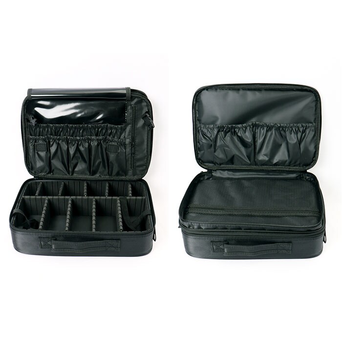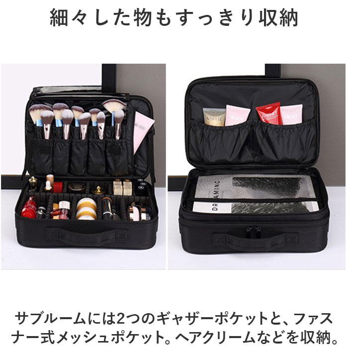 | 商品説明 | メイクアイテムをひとまとめ♪ポケットや仕切り付きで整理整頓ラクラク!「メイクボックス」が新登場。【定位置を決めて迷子知らず◎】増えがちなコスメアイテムやツールを、全部まとめてIN!1つ1つの住所を決めやすく、あれ…どこいった?と探す手間を軽減。【たっぷり入る2スペース仕様】収納力がアップする2スペースタイプ。使いやすく仕分けできるのが嬉しい!【ガバっと開いて出し入れスムーズ】・2スペースともに、左右どちらからも開くダブルファスナーで180度オープン。使いたいアイテムが一目瞭然◎【自分仕様にアレンジできる可動式】耐久性がありつつ、傷付きを防ぐ仕様の仕切り付きスペース。仕切りはお好みの位置に変更でき、ちょこっと大きなパウダーやスキンケア類も収納OK。【ブラシなどのツールもすっきり】フタ裏10個のギャザーポケットには、ブラシ類を収納。面ファスナー式のフラップでこぼれ落ちや汚れをガード。小物が入るファスナーポケットも装備。【サポートベルトでしっかりキープ】両サイドのバックル式ベルトを、お好みの長さに調節。フタを開いた状態を保持できて便利。【細々した物もすっきり収納】サブルームには2つのギャザーポケットと、ファスナー式メッシュポケット。ヘアクリームなどを収納。【持ち運びがスマート&安心設計】上部に持ち手が付いており、移動や持ち運びも簡単。安定感ばっちりなボックス型&クッション材入りで衝撃を和らげて中身を保護。【肩掛けもキャリーオンも自在】長さ調節できるショルダーベルトを取り付けて、肩掛け。背面のベルトをキャリーケースのバーに通すこともでき、プロのメイクさんにもおすすめ。【長く愛用できるシンプルなつくり】使う人を選ばず飽きのこない、シンプルなブラックカラー。場所をとらないサイズ感も魅力。 |