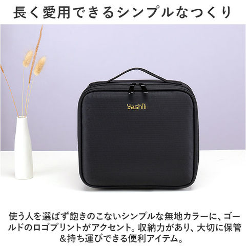 | 商品説明 | メイクアイテムをひとまとめ♪ポケットと仕切り付きで整理整頓ラクラク!「メイクボックス」が新登場。【定位置を決めて迷子知らず◎】増えがちなコスメアイテムやツールを、全部まとめてIN!1つ1つの住所を決めやすく、あれ…どこいった?と探す手間を軽減。【ガバっと開いて出し入れスムーズ】左右どちらからも開くダブルファスナーで180度オープン。使いたいアイテムが一目瞭然◎【自分仕様にアレンジできる可動式】耐久性がありつつ傷付きを防ぐ仕様の仕切り付きスペース。仕切りはお好みの位置に変更でき、ちょこっと大きなパウダーやクッションファンデも収納OK。【ブラシなどのツールもすっきり】仕切りスペースの上には、独立型のブラシ収納。10個のギャザーポケットにブラシ類を入れ、クリアフラップで汚れをガード。【サポートベルトでしっかりキープ】両サイドのバックル式ベルトを、お好みの長さに調節。フタを開いた状態を保持できて便利。【ドレッサーのように使えるミラー】フタ裏にはミラーを♪簡易的なドレッサー代わりになり、メイクもスムーズ。【持ち運びがスマート&安心設計】上部に持ち手が付いており、移動や持ち運びも簡単。安定感ばっちりなボックス型&クッション材入りで衝撃を和らげて中身を保護。【面倒なお手入れは不要】汚れなどはサッと拭き取るだけでOK。お手入れの手間いらず。【長く愛用できるシンプルなつくり】使う人を選ばず飽きのこないシンプルな無地カラーに、ゴールドのロゴプリントがアクセント。収納力があり、大切に保管&持ち運びできる便利アイテム。 |
